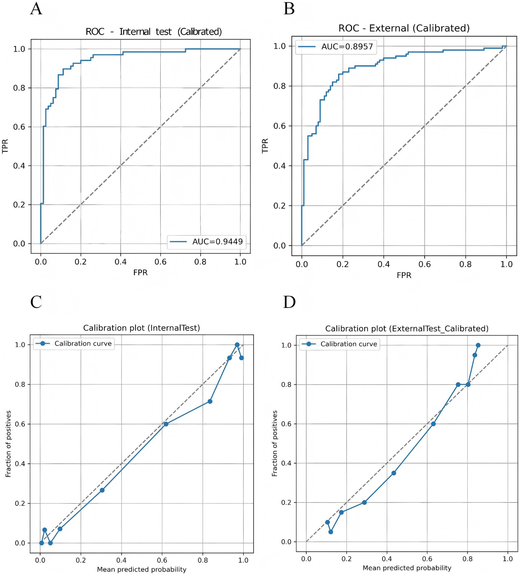 Four graphs show ROC and calibration plots. A: ROC (Internal test, Calibrated) with an AUC of 0.9449, depicting True Positive Rate vs. False Positive Rate. B: ROC (External, Calibrated) with an AUC of 0.8957. C: Calibration plot (Internal Test) showing the fraction of positives against the mean predicted probability. D: Calibration plot (External Test, Calibrated) showing a similar comparison between predicted probability and fraction of positives.