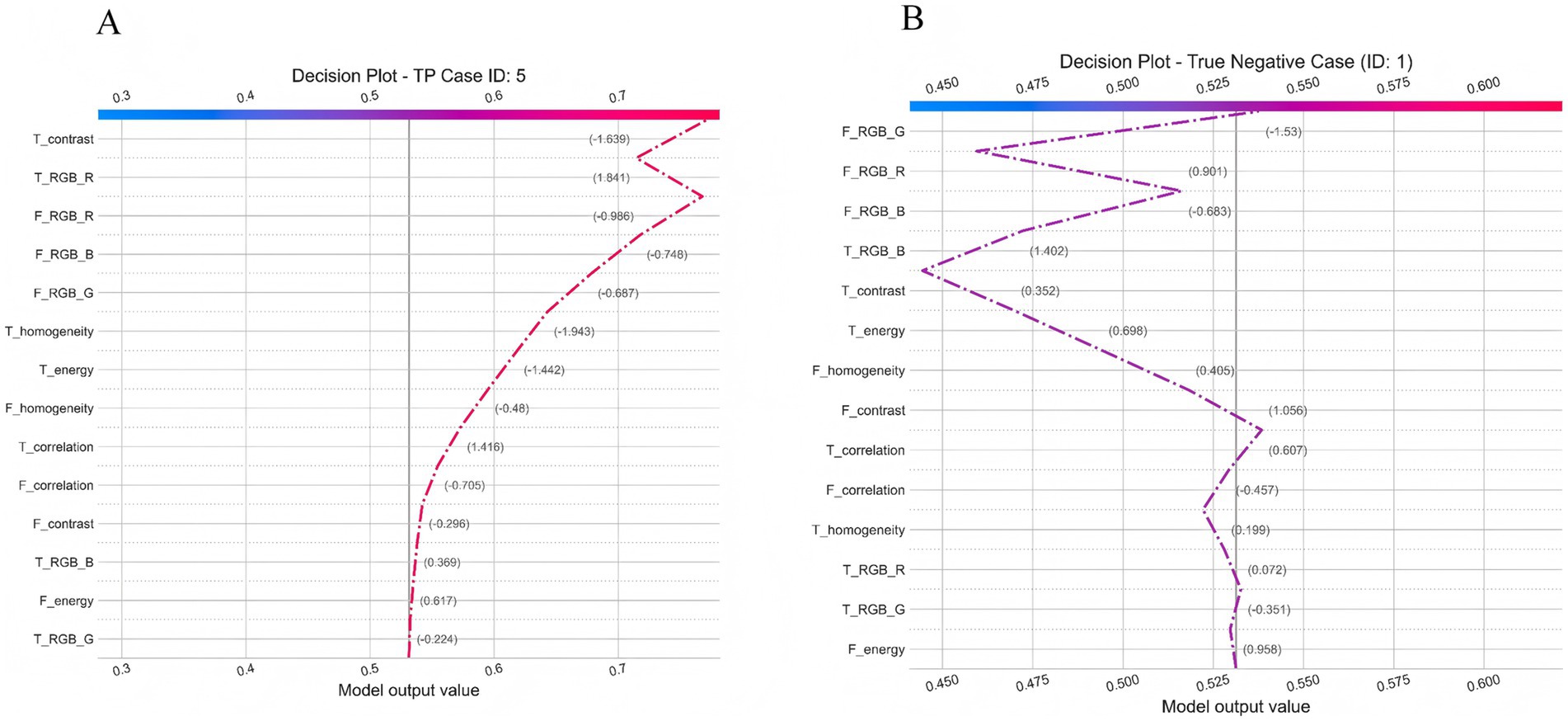 To visualize the model’s reasoning at the individual level, we generated SHAP decision plots for representative true-positive and true-negative cases. Only clinically interpretable facial and tongue color–texture features were included. The plots illustrated how each feature cumulatively influenced the prediction probability toward or away from CAD, revealing dominant contributors in each case (Nazim et al., 2025).