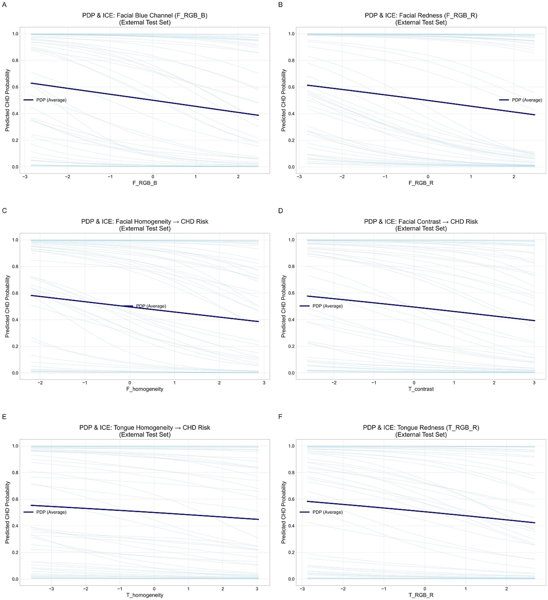 Figure 14. Partial dependence and individual conditional expectation (ICE) curves for key facial and tongue features in the external validation set. (A) Facial blue channel (F_RGB_B). (B) Facial red channel (F_RGB_R). (C) Facial homogeneity. (D) Tongue contrast. (E) Tongue homogeneity. (F) Tongue red channel (T_RGB_R).