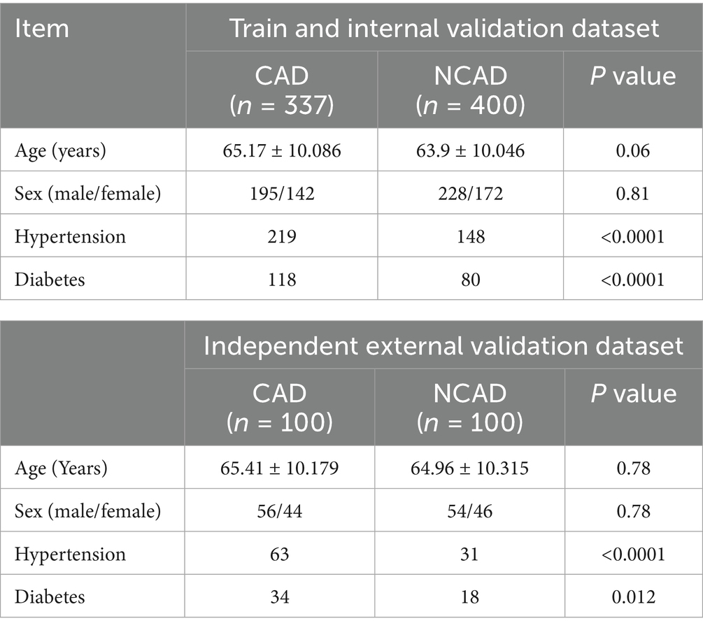 The data for this study were collected from Dongcheng Hospital and Tongzhou Hospital of Dongzhimen Hospital, Beijing University of Chinese Medicine, between July 2023 and July 2024. A total of 737 participants were enrolled at Tongzhou Hospital, including 337 patients with CAD and 400 non-CAD controls, which were used for model training and internal validation. An independent external validation cohort consisted of 200 participants (100 CAD patients and 100 non-CAD controls) recruited from Dongcheng Hospital during the same period. Detailed baseline characteristics of all cohorts are presented in Table 1.