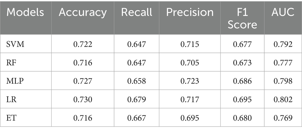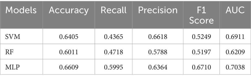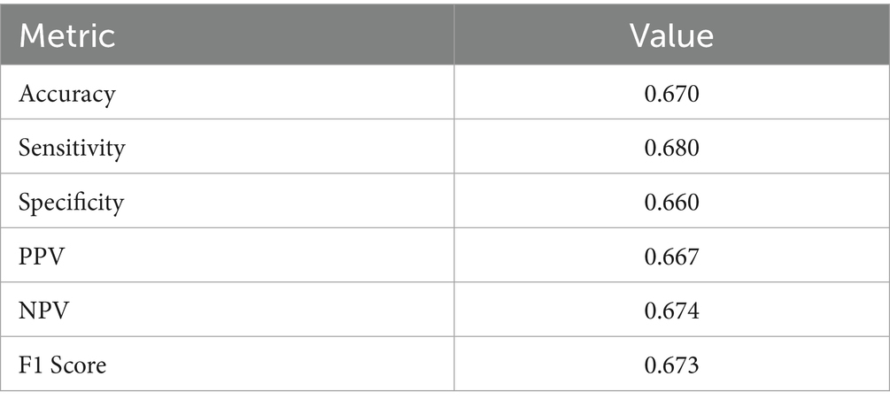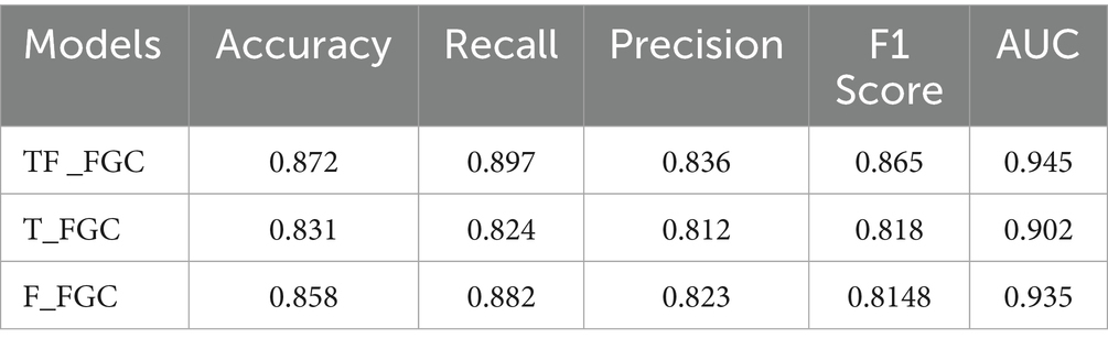 During the testing phase, the model’s performance was comprehensively assessed using multiple metrics (Gorur et al., 2018; Gorur et al., 2019), including accuracy, area under the receiver operating characteristic curve (AUC), F1 score, recall (sensitivity), and precision (positive predictive value, PPV) (Equations 36). In this context, true positives (TP) correspond to correctly identified CAD cases, true negatives (TN) to correctly classified non-CAD controls, false positives (FP) to non-CAD cases erroneously classified as CAD, and false negatives (FN) to CAD cases incorrectly labeled as non-CAD. This multi-dimensional evaluation framework enables balanced assessment of both overall discriminative ability and class-specific performance, ensuring the model’s reliability and practical applicability in clinical diagnostic settings.