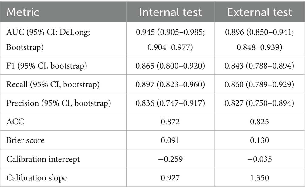 The TF_FGC model trained on the development set is directly applied to the external test set without any retraining or fine-tuning. The model outputs are used to calculate predicted probabilities for CAD, and the model’s generalization ability is evaluated using standard classification performance metrics (accuracy, recall, precision, F1 score, AUC, etc.). Calibration performance was further evaluated using the Brier score, calibration intercept, and slope. To improve the reliability of predicted probabilities, Platt scaling was applied prior to external testing.