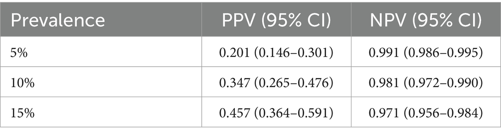 To better reflect real-world clinical application scenarios, positive and negative predictive values (PPV and NPV) were reweighted using Bayes’ theorem under three realistic disease prevalence settings (5, 10, and 15%), corresponding to community screening, general outpatient, and cardiology referral populations, respectively. Finally, decision curve analysis (DCA) was performed to quantify the net clinical benefit across a range of probability thresholds (0.1–0.6), and the results were compared with those of the CAD Consortium Basic model as well as the “treat-all” and “treat-none” strategies.
