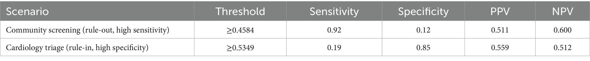 A logistic regression model was constructed using age (continuous variable, in years) and gender (female = 0, male = 1) as independent variables, with CAD diagnosis as the dependent variable. The model outputs predicted probabilities for CAD, which can be thresholded to simulate different clinical scenarios. For community screening (prevalence ~5%, rule-out), a high-sensitivity threshold was selected to minimize missed diagnoses. For cardiology triage (prevalence ~30%, rule-in), a high-specificity threshold was chosen to reduce false-positive referrals.