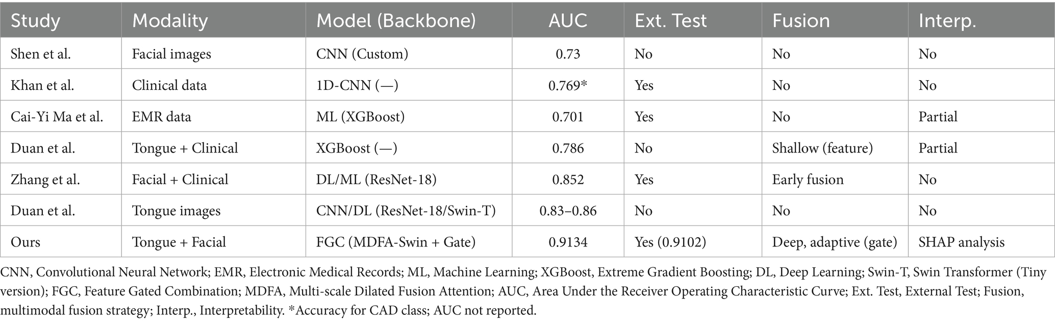 Several studies have explored deep learning for CAD detection using facial or tongue images. Lin et al. (2020) developed a facial image-based model achieving a sensitivity of 0.80 and an AUC of 0.730. Khan Mamun and Elfouly (2023) used NHANES data with a 1D-CNN, reporting an accuracy of 76.9%. Ma C. Y. et al. (2024) predicted CAD risk using electronic medical records, achieving an AUC of 0.701. Duan et al. (2024b) combined tongue image features with clinical factors and XGBoost, reporting an accuracy of 0.760 and an AUC of 0.786. More recently, Zhang et al. (2025) proposed a multimodal model using facial images and clinical variables, achieving an AUC of 0.852. Duan et al. (2024a) and Duan et al. (2024b) applied deep learning (e.g., CNNs, lightweight networks) to tongue image analysis, reporting AUCs between 0.83 and 0.86.