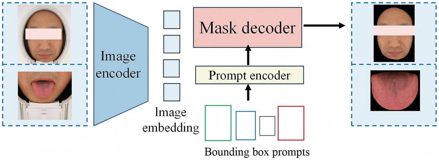 Currently, there are relatively few segmentation algorithms specifically designed for TCM data. In the past, training a high-quality medical image segmentation model required extensive manual annotation, which is labor-intensive. This is particularly challenging in the field of TCM due to the lack of public data and the specialized nature of data collection and annotation. MedSAM (Ma J. et al., 2024) is an optimized model based on SAM (Mazurowski et al., 2023), designed to accommodate various medical image segmentation tasks (Figure 3). MedSAM significantly improves the recognition and segmentation of targets in medical images through fine tuning on large medical image datasets. It demonstrates strong zero-shot generalization across various medical tasks, significantly reducing the burden of manual annotation (Zhang et al., 2024). However, to date, no studies have applied MedSAM to the segmentation of tongue and facial images. In this study, we used MedSAM to segment the tongue and facial regions. Segmentation was performed using automatic point prompting with default parameters, without fine-tuning or threshold post-processing on our dataset. To ensure segmentation quality, images were strictly controlled during acquisition, with blurred, occluded, or low-quality images excluded. To evaluate segmentation performance, we randomly selected 200 images from the dataset (100 tongue, 100 face), and two annotators with experience in TCM imaging performed pixel-level annotations using LabelMe. The results showed that MedSAM achieved high segmentation performance for both tongue and facial images, effectively excluding irrelevant background regions (Tongue image: IoU = 0.9393, Dice = 0.9687; Facial image: IoU = 0.9676, Dice = 0.9515).