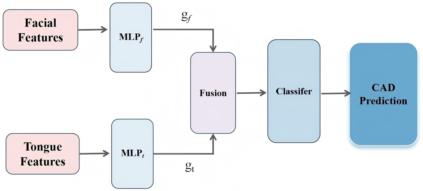 In recent years, numerous researchers have leveraged artificial intelligence technologies to develop intelligent diagnostic models for CAD by integrating multi-source data such as medical imaging, blood biomarkers, and electronic medical records (Coenen et al., 2018; Vallée et al., 2019; Shen et al., 2024; Addisu et al., 2025). These models have introduced new approaches for early disease detection and risk assessment. However, their effectiveness largely depends on access to high-quality clinical data, the acquisition of which often involves complex procedures and high costs, thereby limiting their practical implementation in primary healthcare settings and large-scale population screening. In contrast, tongue and facial image data offer advantages such as ease of acquisition, non-invasiveness, and low cost. Existing studies have demonstrated the potential clinical value of these features in supporting CAD diagnosis, yet their broader application in real-world medical scenarios remains underexplored and lacks systematic integration. Currently, most studies on CAD diagnosis rely solely on either tongue features or facial features, and few have explored models that integrate multi-dimensional features from both modalities. To address the challenges faced in CAD diagnosis, this study proposes a non-invasive diagnostic model based on the integration of tongue and facial features. The model introduces a feature-wise gating mechanism to enable adaptive weighted fusion of tongue and facial features under multimodal input, thereby improving both individualized diagnostic accuracy and the model’s discriminative capability. In addition, the model incorporates the SHapley Additive exPlanations (SHAP) method to analyze the contribution of each feature, enhancing interpretability and providing more reliable decision support for clinical practice (Pearson, 1901; Yu et al., 2025). Notably, the model is well-suited for a wide range of application scenarios, including community health centers, physical examination institutions, and daily home health monitoring. It does not rely on advanced medical equipment or specialized personnel, allowing for efficient diagnosis and timely medical guidance for patients. The workflow of proposed methodology is shown in Figure 1.