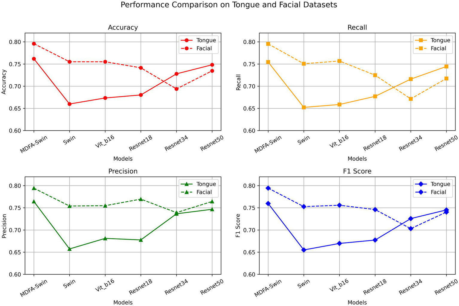 Figure 6. Validation performance of the MDFA-Swin model and baseline models on the tongue and facial image datasets.
