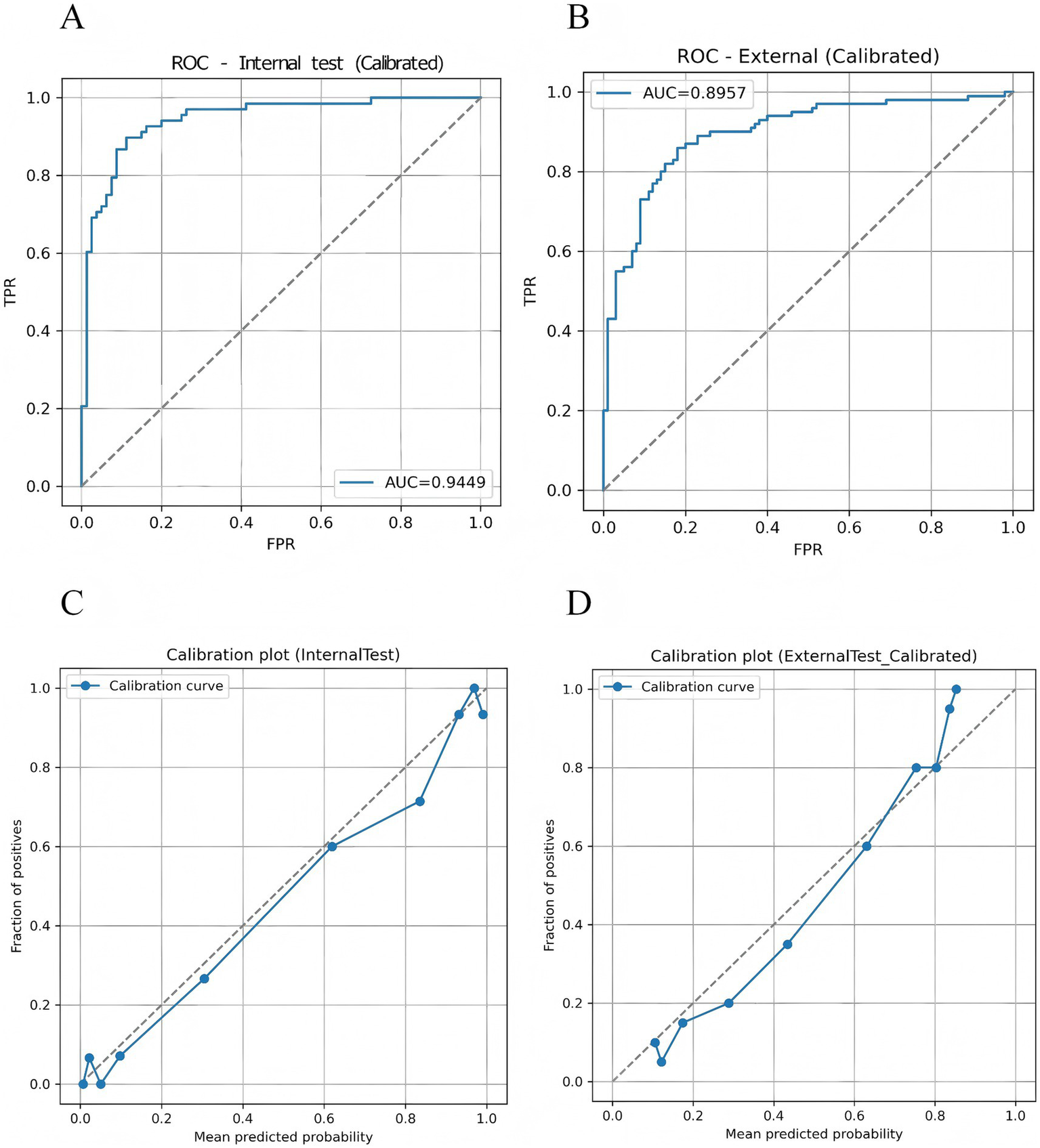 Figure 9. Discriminative performance and probability calibration of the TF_FGC model. (A) Receiver operating characteristic (ROC) curve for the internal validation set. (B) ROC curve for the independent external validation set. (C) Calibration plot for the internal validation set. (D) Calibration plot for the external validation set.