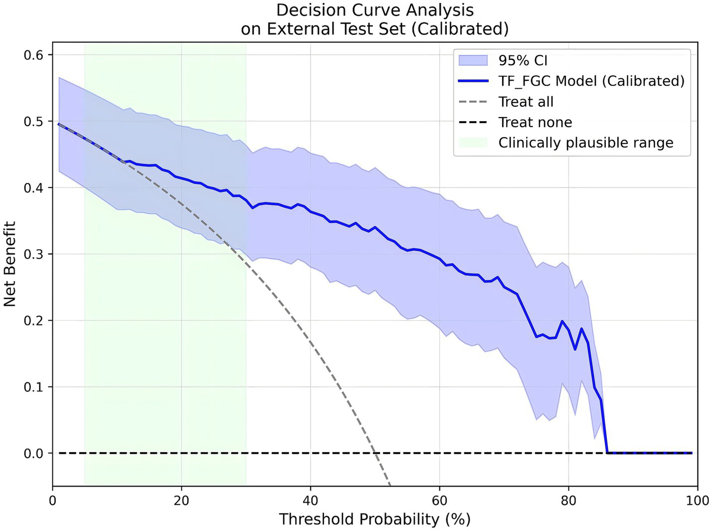 Considering the model’s potential value in real-world screening scenarios, prevalence-weighted PPV and NPV were further estimated under hypothetical disease prevalences of 5, 10, and 15%. As summarized in Table 6, the PPVs (95% CI) were 0.201 (0.146–0.301), 0.347 (0.265–0.476), and 0.457 (0.364–0.591), respectively, while the NPVs (95% CI) remained consistently high at 0.991 (0.986–0.995), 0.981 (0.972–0.990), and 0.971 (0.956–0.984). These findings indicate that the TF_FGC model maintains excellent exclusion capability in low-prevalence populations, supporting its potential use as an auxiliary tool for preliminary screening of obstructive CAD risk. Furthermore, DCA (Figure 10) demonstrated that, within the clinically relevant probability threshold range of 0.1–0.6, the TF_FGC model provided consistently higher net benefit than the “treat-all” or “treat-none” strategies, confirming its practical utility in clinical decision-making.