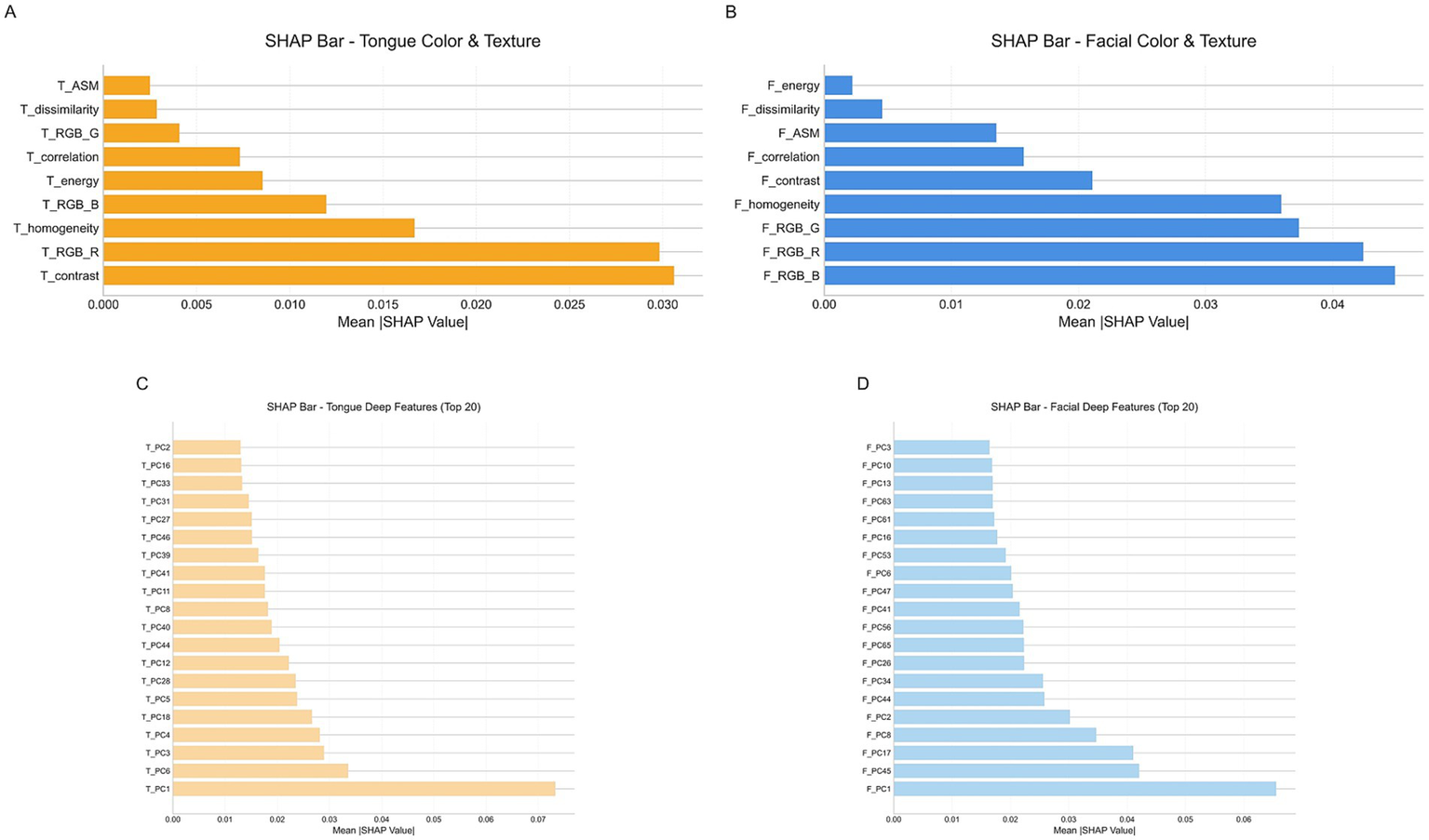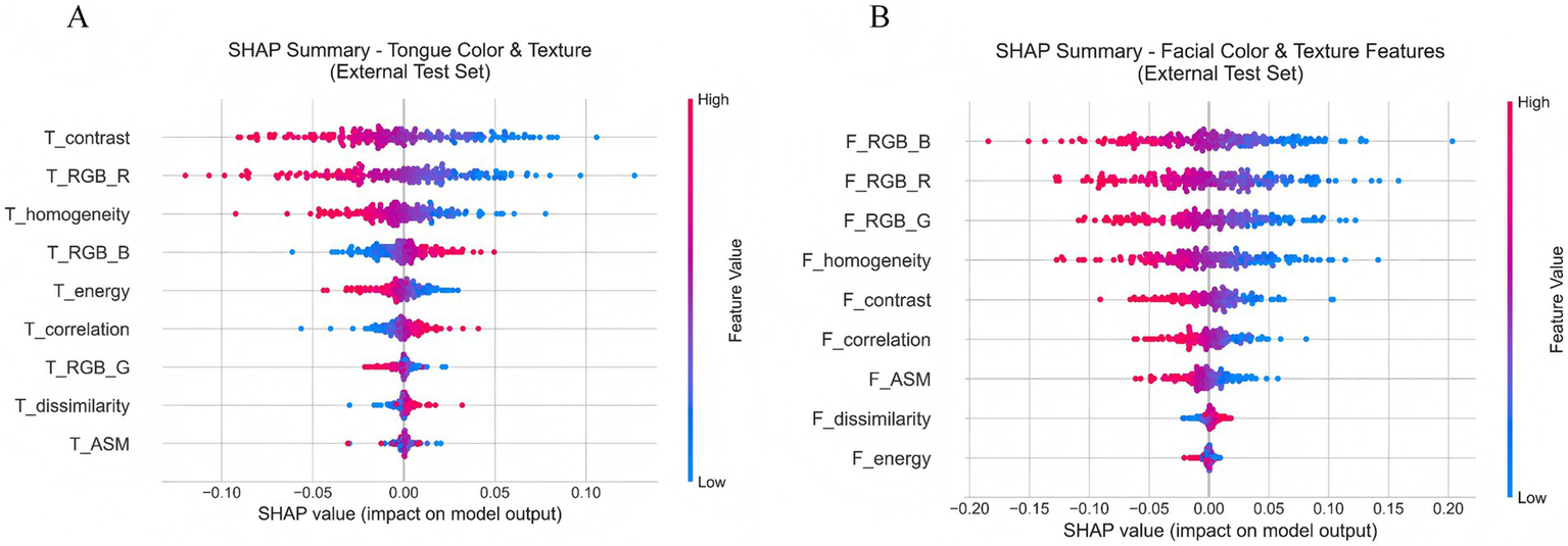 We applied the SHAP method to quantify each feature’s contribution to model prediction (Lundberg and Lee, 2017; Khorram et al., 2021). Using the TreeExplainer algorithm, SHAp values were computed for all samples in the external test set. Four feature groups were analyzed separately: facial color–texture, tongue color–texture, facial depth, and tongue depth features. Mean absolute SHAP values were used to rank feature importance, and SHAP summary plots were generated to visualize both contribution magnitude and direction.