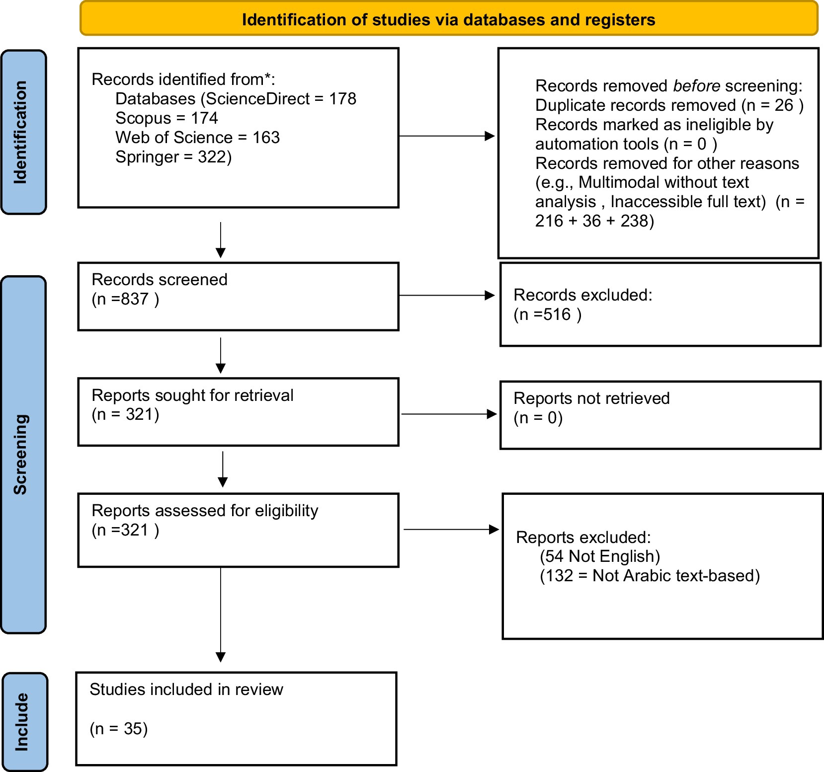 In the first step, four major research databases, ScienceDirect, Scopus, Web of Science, and Springer, were searched through queries, and as many papers as possible were collected. The search query is “detect” AND (“cyberbullying” OR “hate speech” OR “harassment” OR “offensive”) AND (“machine learning” OR “natural language processing” OR “deep learning”) AND “Arabic.” Based on initial exclusion criteria, papers were selected after carefully reading the abstracts of the papers in the second step. A final list of papers is prepared after reading the full articles and applying further exclusion criteria (35 papers). Figure 1 depicts the literature review process.