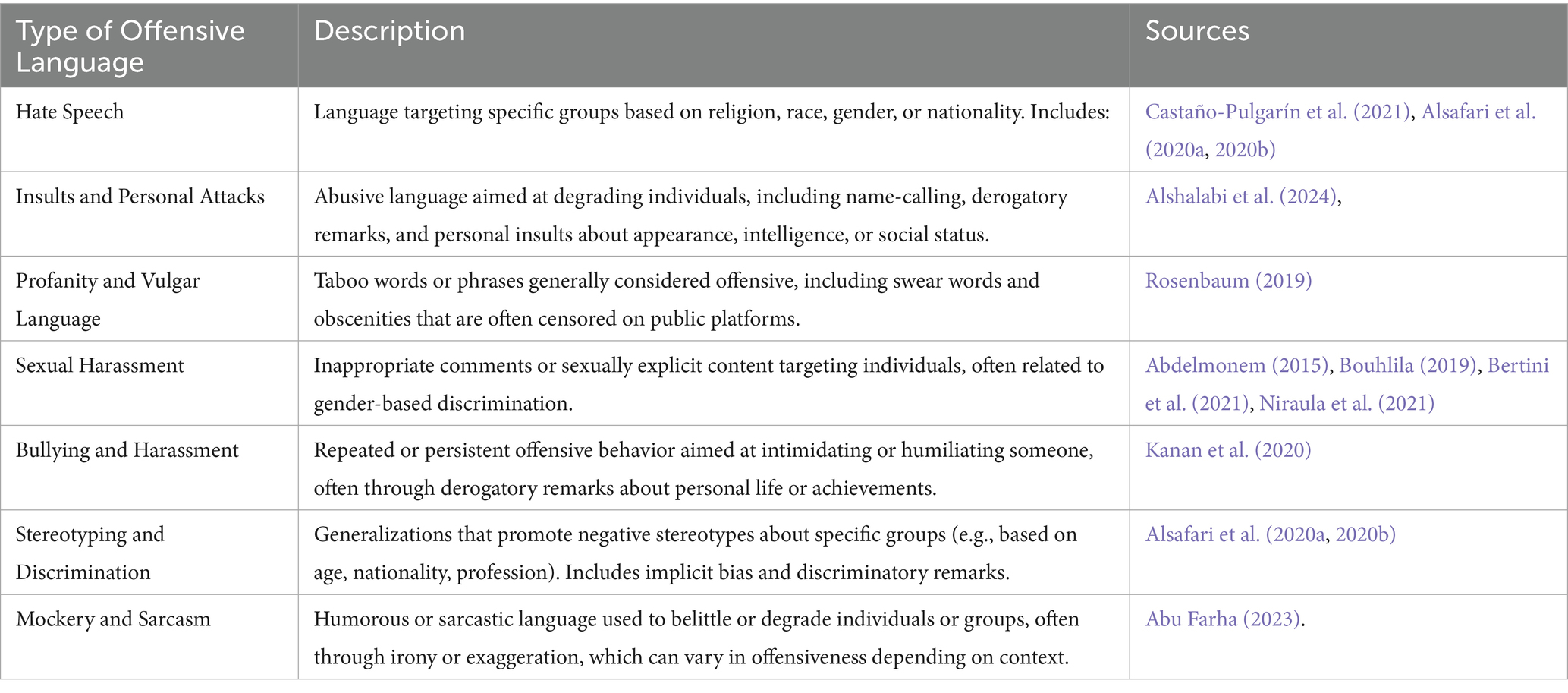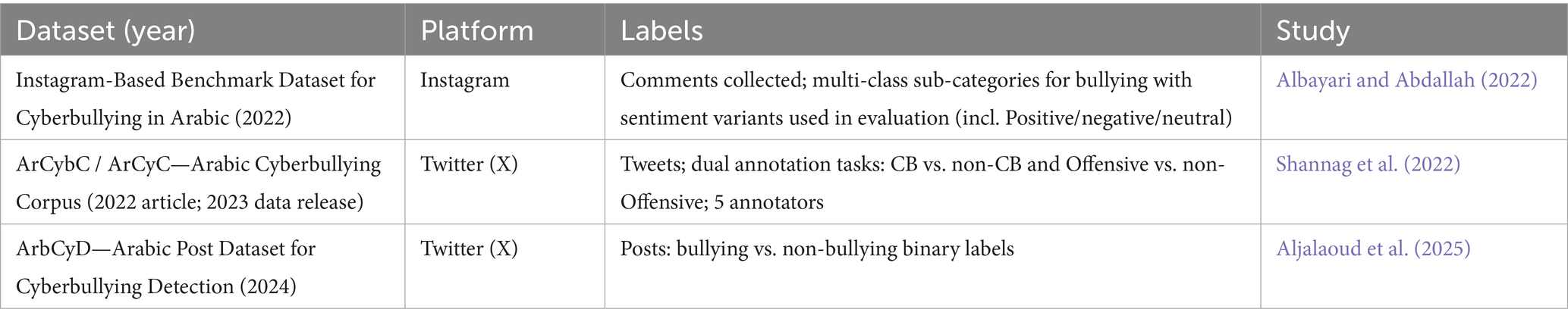Aljalaoud, H., Dashtipour, K., and AI Dubai, A. (2025). Arabic cyberbullying detection: a comprehensive review of datasets and methodologies. IEEE Access. doi: 10.1109/ACCESS.2025.3561132