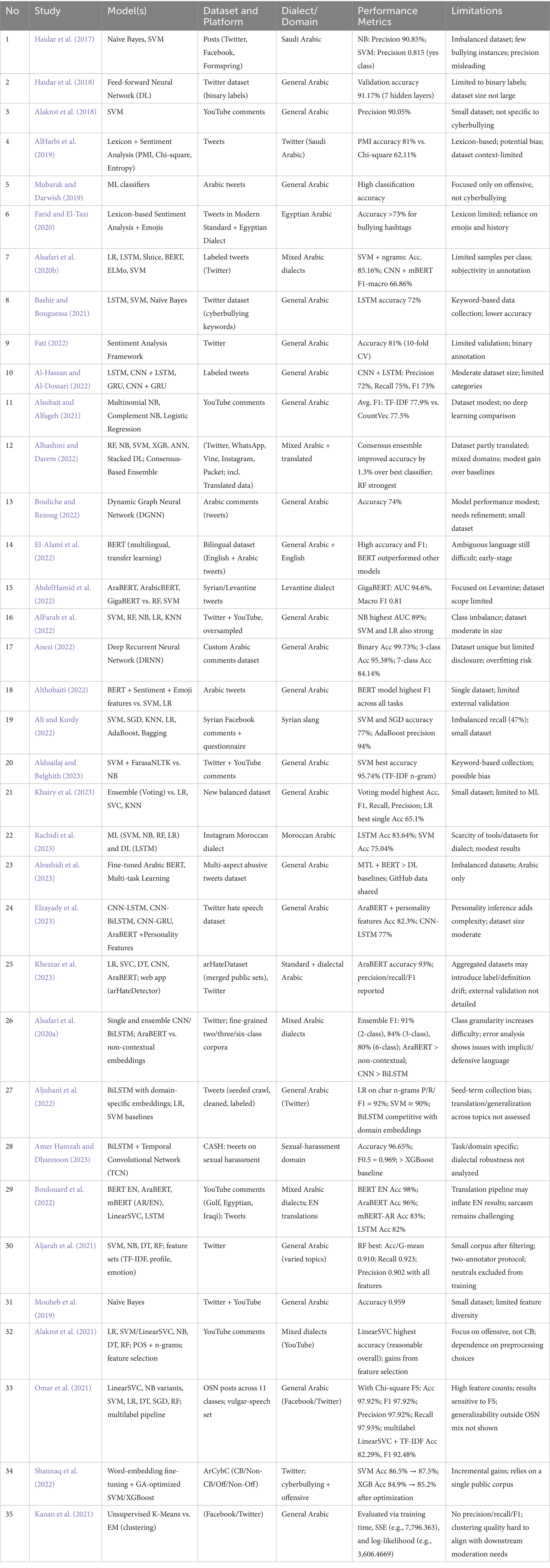 Although numerous studies have examined cyberbullying detection methods broadly or across various languages, there is a paucity of focused analyses on Arabic-language detection, given the unique challenges presented by Arabic’s morphological intricacies and dialectal diversity (Mubarak and Darwish, 2019; AbdelHamid et al., 2022). The majority of the earlier studies predominantly analyze general patterns in cyberbullying detection, concentrating on English-language research (Alakrot et al., 2018; Bashir and Bouguessa, 2021). Although current studies recognize dataset imbalances and biases in social media-derived training data, they frequently neglect to consider privacy concerns and the ethical ramifications of automated cyberbullying detection among Arabic-speaking groups (Omar et al., 2021; Amer Hamzah and Dhannoon, 2023). This study addresses real-time detection concerns, the balance between moderation and free speech, and the necessity for privacy-preserving machine learning algorithms in social media monitoring (Kanan et al., 2021). This paper distinctly focuses on the thorough assessment of ML and DL models in detecting cyberbullying in Arabic. The prior systematic literature review by Castaño-Pulgarín et al. (2021), addressed cyberbullying detection on studies that provided exploratory data about the Internet and social media as a space for online hate speech, types of cyberhate, terrorism as an online hate trigger, online hate expressions and the most common methods to assess online hate speech. Balakrisnan and Kaity (2023) also did an SLR focusing on three main areas regarding cyberbullying detection through machine learning: the algorithms employed, the features used for detection, and the performance measures of these methods. The prior studies and reviews neglect Arabic-specific issues such as root-based word creation, tokenization complexities, and script intricacies.