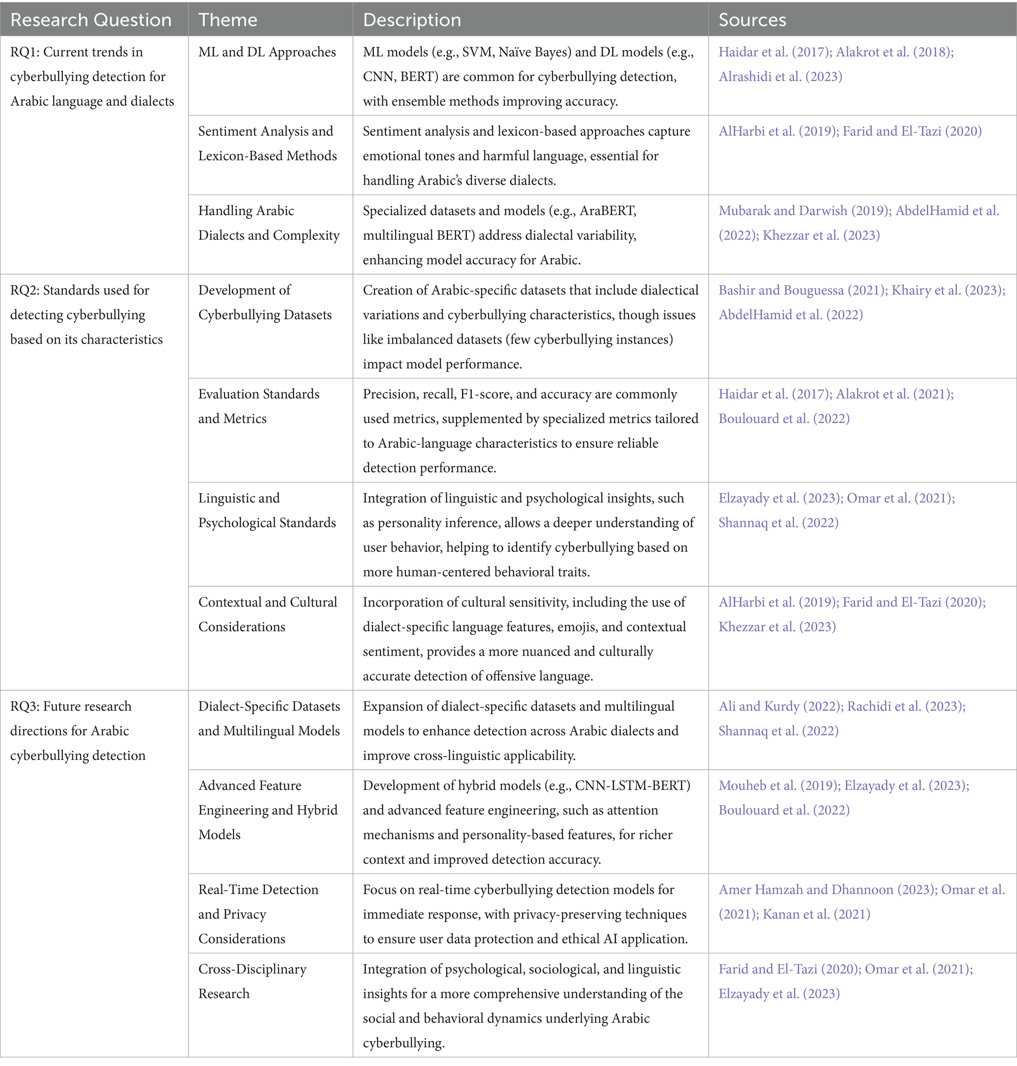 Additionally, cross-disciplinary research involving psychology, sociology, and computational linguistics could establish standards for understanding the social dynamics underlying cyberbullying, offering insights beyond linguistic patterns (e.g., Omar et al., 2021). Table 4 shows the summary of the themes related to each research question.