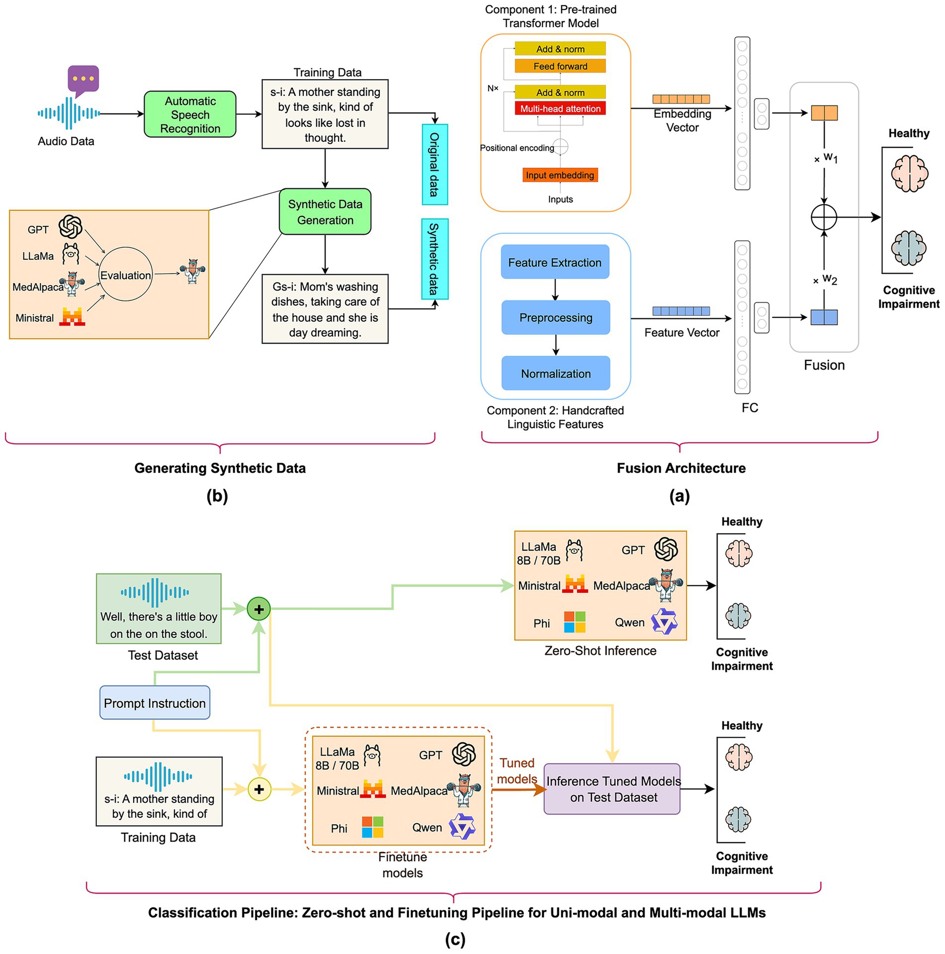Figure 1. Overview of the study’s methodology: (a) fusion model: automatic speech-recognition transcripts are transformed into deep transformer embeddings and merged with handcrafted linguistic features in a fully connected fusion layer; (b) generative synthetic data: GPT-4, LLaMA-8B/70B, MedAlpaca-7B, and Ministral-8B create additional transcripts that mirror the original distribution for augmenting the training dataset; (c) classification pipeline—zero-shot and fine-tuning for unimodal and multimodal LLMs: Both unimodal and multimodal LLMs were evaluated in both zero-shot and fine-tuning regimes to assign “cognitively healthy” or “cognitively impaired” labels on a held-out test set.