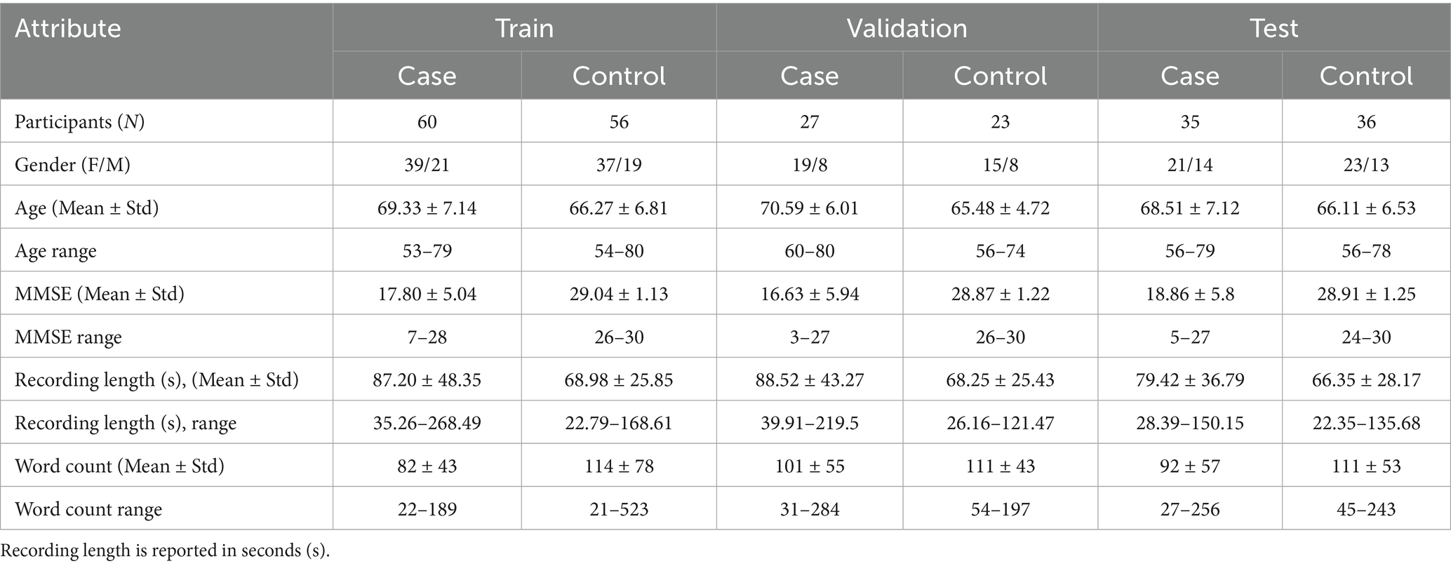 Participant characteristics are summarized in Table 1. All individuals underwent comprehensive neuropsychological evaluations, including verbal tasks and the Mini-Mental State Examination (MMSE). Diagnoses were assigned by clinical specialists (neurologists and neuropsychologists) following full clinical assessments. All participants were older than 53 years, and females comprised more than 60% of each group. MMSE scores in the case group ranged from 7–28 (training), 3–27 (validation), and 5–27 (test), reflecting mild to severe cognitive impairment, while scores in the control group ranged from 24–30, consistent with normal cognition. On average, control participants produced more words and had shorter recordings than cases, consistent with expected language production differences in dementia.