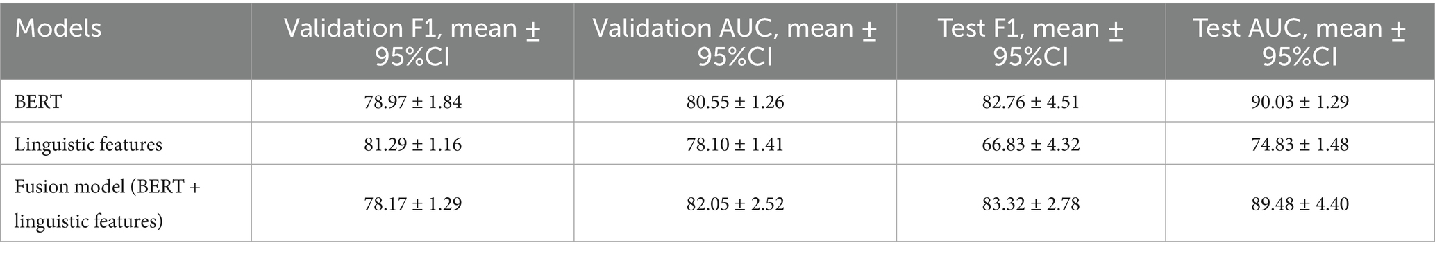 To combine the strengths of transformer representations and domain-informed features, we developed a fusion classifier (Figure 1). Embeddings from the top-performing transformer were passed through a two-layer MLP with 256 hidden units; linguistic features entered a separate two-layer MLP with 128 units. We applied a late fusion strategy by combining the two outputs using a learnable weighted sum. The fusion model was trained using AdamW (learning rate = 2 × 10−5, weight decay = 2 × 10−3) for 50 epochs. Each experiment was repeated five times with different random seeds. We report the mean and 95% confidence intervals of F1-score and AUC-ROC on the validation and test sets.