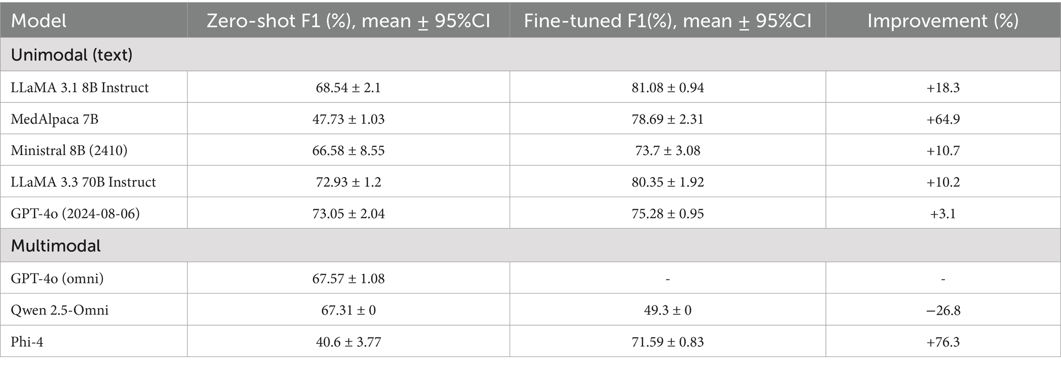 We evaluated Qwen and Phi in both zero-shot and fine-tuning settings, whereas GPT-4o was assessed in zero-shot only. This design allowed comparison of joint acoustic-linguistic modeling against text-only baselines and evaluation of the benefits of multimodal fine-tuning.