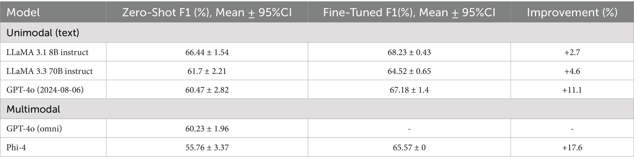 For multimodal classification, we opted for GPT-4o (omni) and Phi-4, again applying both zero-shot and fine-tuning strategies, as these models demonstrated strong performance and robust handling of multimodal inputs.