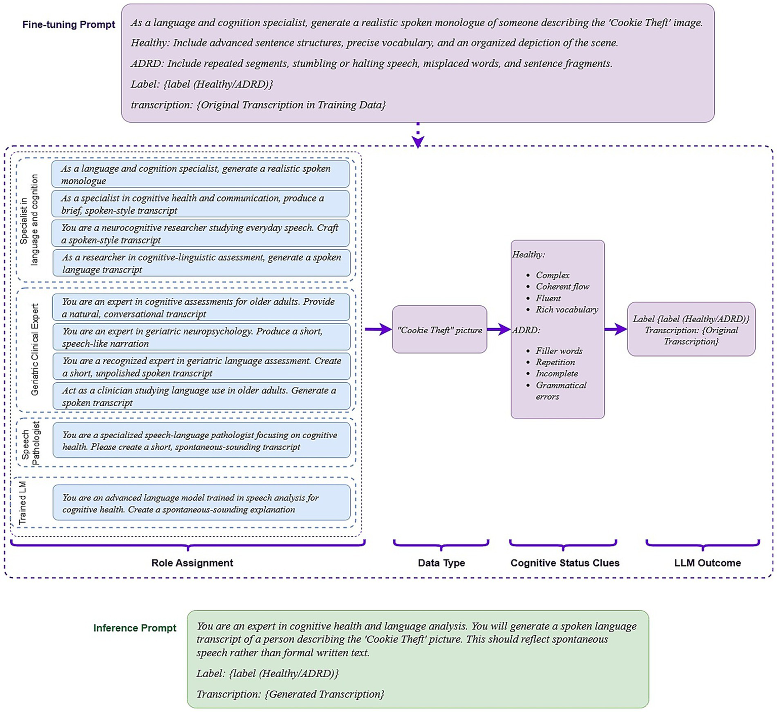 Figure 2. Prompt-engineering workflow for synthetic transcript generation and classification. Fine-tuning prompt: A role-specific instruction directs the LLM to describe the Cookie-Theft picture in spoken language, embedding class-defining cues—advanced syntax and fluent flow for cognitively healthy (healthy) speech, repetition and grammatical slips for cognitively impaired (ADRD) speech; Role templates: Ten expert personas (e.g., language-and-cognition specialist, geriatric clinician, speech-language pathologist) provide prompt diversity while the task wording remains constant; data & cues: the prompt explicitly references the cookie-Theft image and the cognitive cues the model should express; output: each generated transcript is saved with its label (Healthy or ADRD); inference prompt: a neutral expert persona requests a transcript label without repeating class hints, encouraging the model to rely on patterns learned during fine-tuning.
