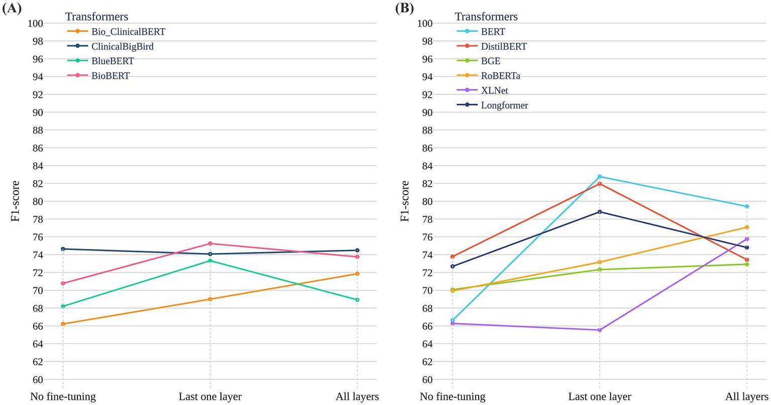 Figure 3. Performance of general-purpose and clinical-domain transformer models across fine-tuning strategies on the ADReSSo Benchmark. (A) F1-scores of six general-purpose models across three strategies: no fine-tuning, last-layer fine-tuning, and full fine-tuning. BERT and DistilBERT showed the largest gains with last-layer fine-tuning. (B) F1-scores of four clinical-domain models pretrained on biomedical and clinical corpora (e.g., PubMed, MIMIC-III). Performance gains were modest across all strategies, with overall F1-scores lower than those of general-purpose models.