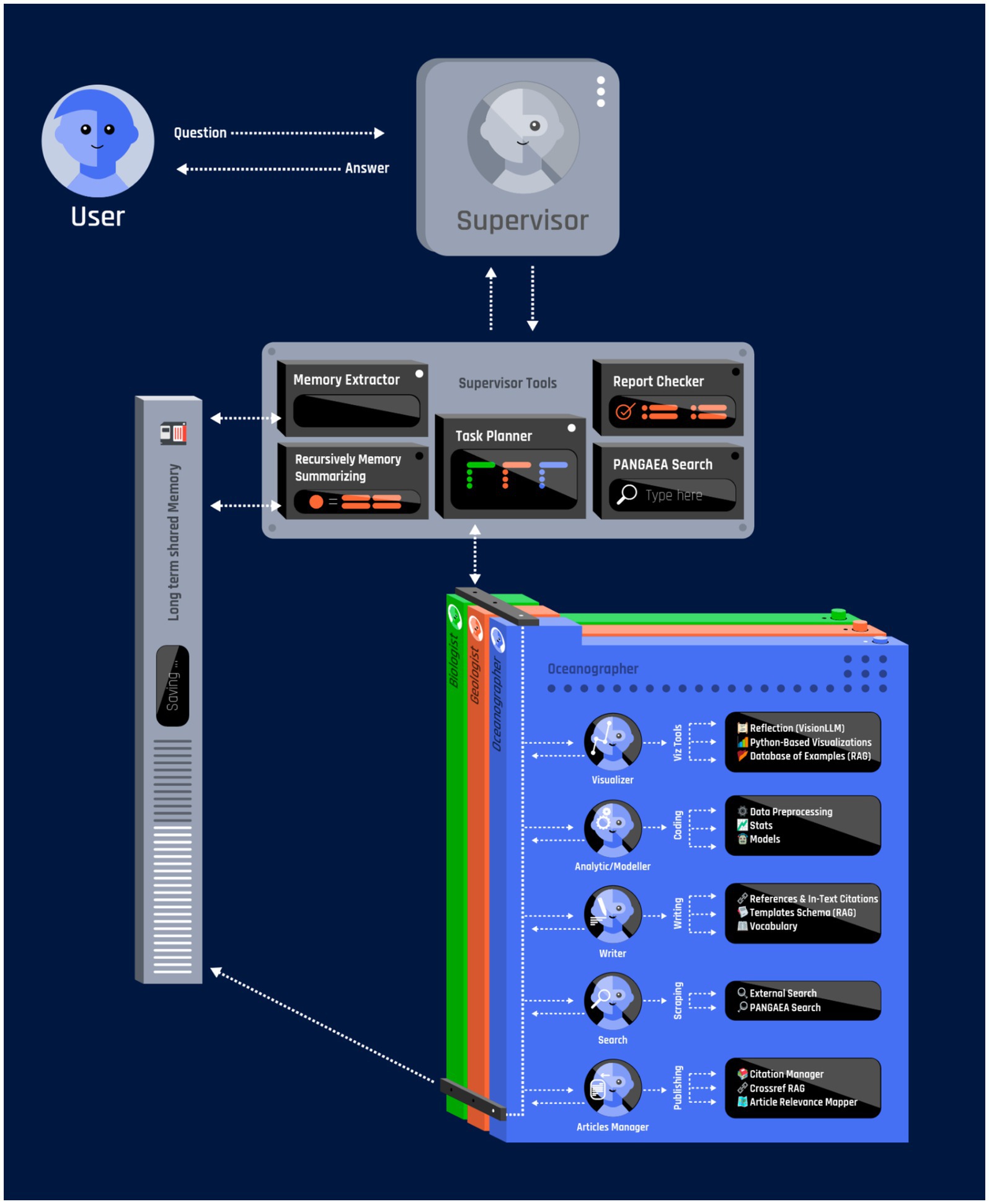 We chose a centralized orchestration approach, where the supervisor agent serves as the command-and-control node for the entire pipeline, handling sub-task delegation, resource allocation, and consolidation of final results among specialized agents (Figure 1). The system supports the dynamic creation of specialized agents based on the tasks assigned to it. Upon receiving user requests, the supervisor agent constructs agent subgraphs tailored to specific subdomains—oceanography, geology, climatology, ecology, or others—depending on the nature of the query. Each agent operates with localized memory buffers for context retention, set of tools and retrieval-augmented generation (RAG) capabilities that draw upon curated knowledge sources. Such a system is designed to efficiently search through diverse data collections, perform contextual analyses, produce high-quality visualizations, and ultimately generate comprehensive documentation.