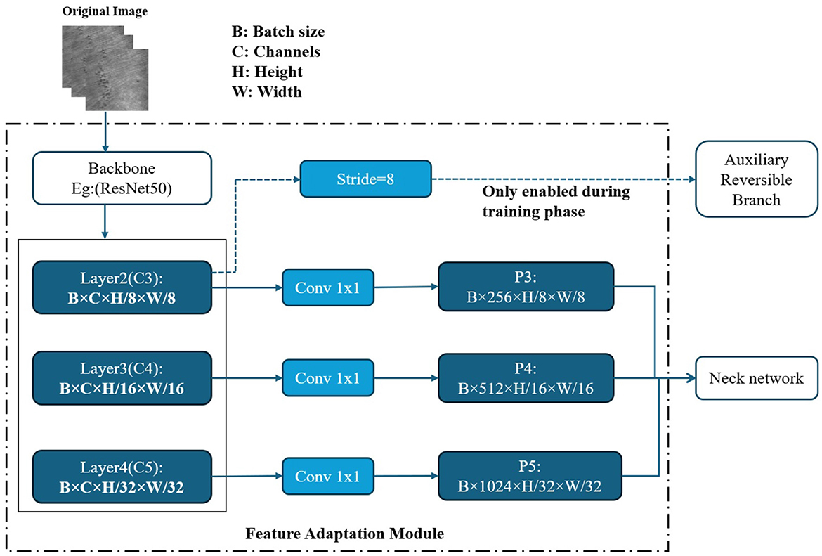 In the actual docking process, due to the difference in the number of original channels of different backbones, we introduced a 1 × 1 convolution layer after each output scale to linearly map the number of channels to unify them into the input dimension expected by YOLOv9-C Neck, that is, P3 is 256 channels, P4 is 512 channels, and P5 is 1,024 channels. The adjusted feature map is input to the Neck network to complete multi-scale feature fusion and passed to the detection head. In addition, all alternative trunks retain the output of the stride = 8 feature map (i.e., P3 layer) for connecting to the Auxiliary Reversible Branch, which is only enabled during the training phase to improve the quality of gradient propagation and model convergence speed, and is removed during the inference phase without increasing the inference overhead. In this way, we have achieved seamless replacement and unified interface of the six trunk structures under the YOLOv9-C framework, ensuring the comparability between structures and providing a basis for subsequent performance evaluation and analysis. The detailed architecture information of the corresponding adaptation layers for each backbone network is provided in Table 1.