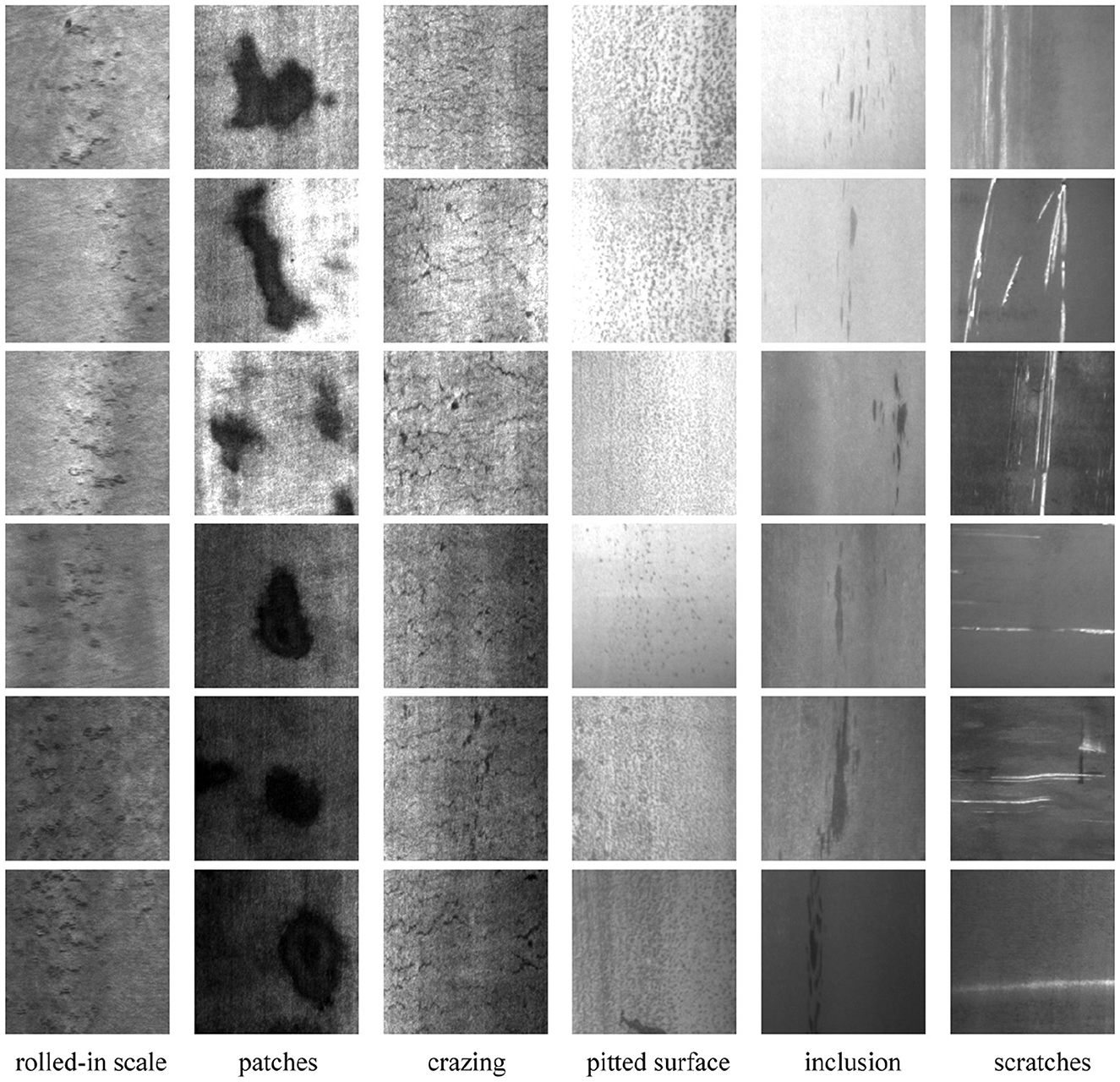 The NEU-DET dataset (Song and Yan, 2013), produced by Kechen Song's team at Northeastern University in China, comprises 1800 images of surface defects on hot-rolled steel strips, divided into six categories: crazing (Cr), inclusions (In), patches (Pa), pitted surface (Ps), rolled-in scale (Rs), and scratches (Sc). Each defect category contains 300 images with a resolution of 200 × 200 pixels. Considerable intra-class variability is present, as illustrated in Figure 3 (Song and Yan, 2013), where scratches may appear horizontally, vertically, or diagonally. At the same time, inter-class similarities also exist; for instance, rolled oxide, cracks, and pockmarks share overlapping features. Annotations specifying the class and location of each defect are provided by the dataset's authors, which facilitates defect detection tasks (He et al., 2019).