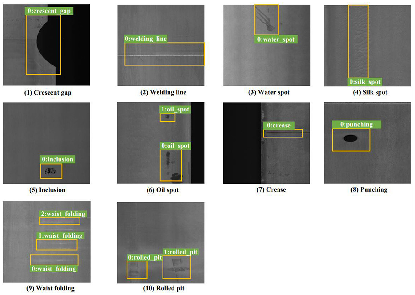 The GC10-DET dataset (Lv et al., 2020), released by Tianjin University in 2020, extends the evaluation to a broader range of metallic surface defect types. It consists of 2300 grayscale images with 3563 labeled objects belonging to ten categories: punched holes (Ph), welds (Wl), crescent cracks (Crg), water spots (Ws), oil spots (Os), silk spots (Ss), inclusions (In), rolling pits (Rp), creases (Cr), and waist creases (Wf). Bounding box annotations are provided for all labeled defects, and only eight images remain unlabeled. Unlike NEU-DET, GC10-DET does not include predefined train/validation/test splits, allowing flexible experimental configurations. Figure 4 illustrates representative examples with annotations. By covering a wider variety of defect patterns on steel plates, GC10-DET provides complementary evidence for assessing the robustness and generalization of detection models.