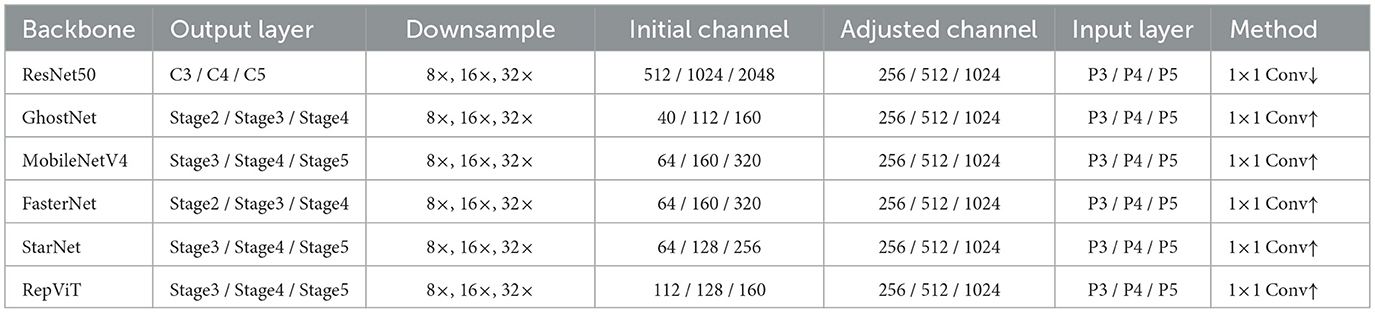 To enhance detection performance and computational efficiency, several lightweight or hybrid-structured backbones were evaluated as replacements for ResNet50 referred to Figure 5.