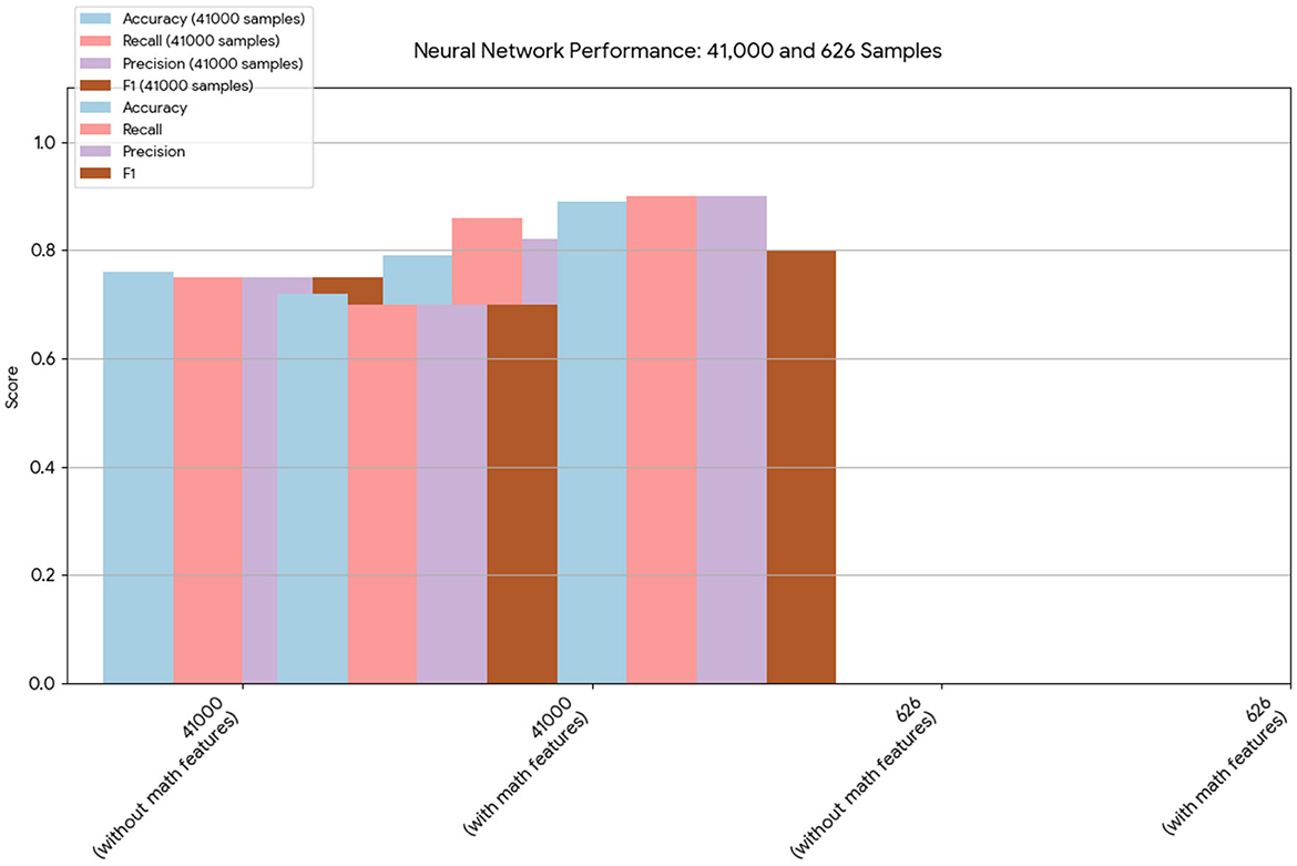 Figure 1. This chart provides a direct comparison of the neural network results on the 41,000- and 626-sample datasets. In both cases, the models that included the mathematical model features demonstrated improved overall performance, particularly in terms of accuracy and recall.
