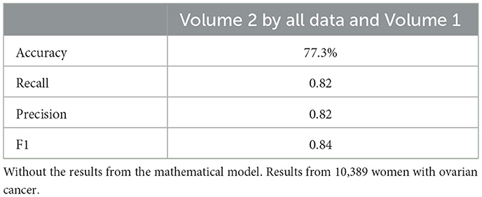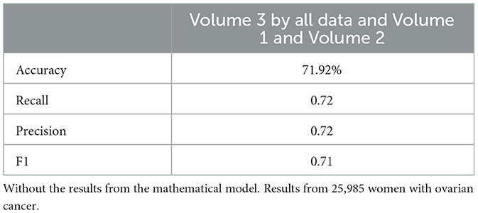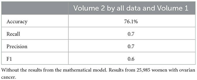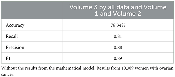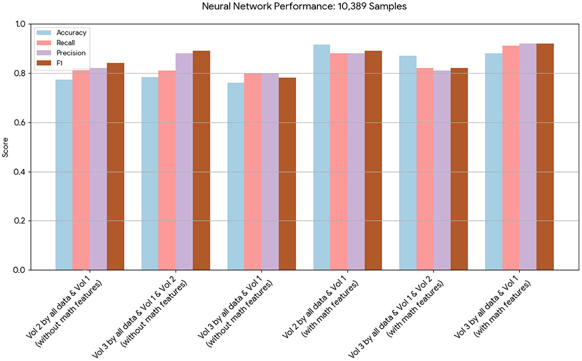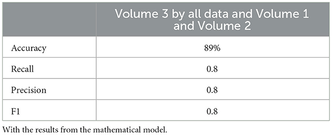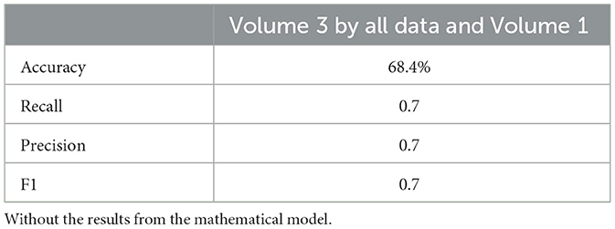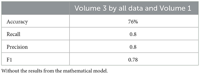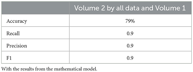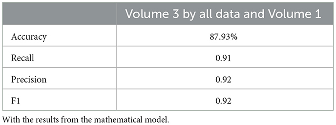 Neural network performance metrics (accuracy, recall, precision, F1score) without mathematical features are reported in Tables 6–8, 14–16, 22, and 23. The results obtained with mathematical features are presented in Tables 9–11, 17–19, 24, and 25. For example, Volume 2 accuracy increased from 77.3% (F1score 0.84, Table 6) to 91.42% (F1score 0.89) when including mathematical model outputs.