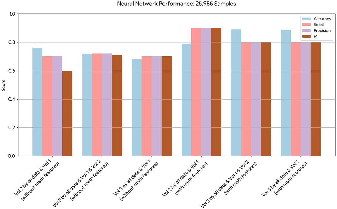 Figure 3. This chart presents the performance of neural network models on 25,985 samples. It highlights that, while both sets of models performed well, those incorporating the mathematical model features achieved higher scores in terms of accuracy, recall, and precision.