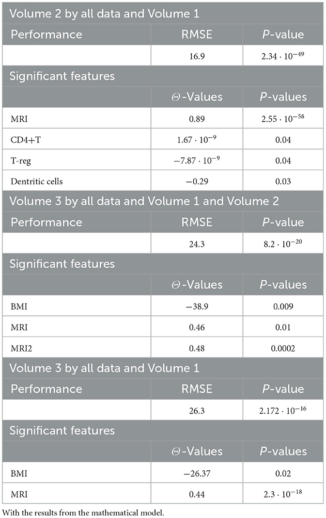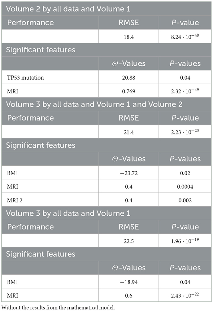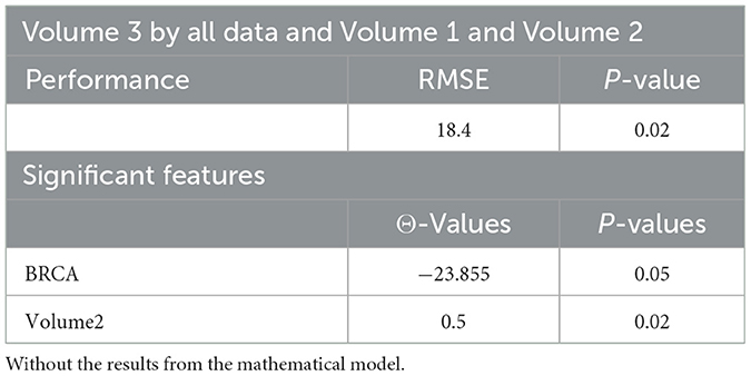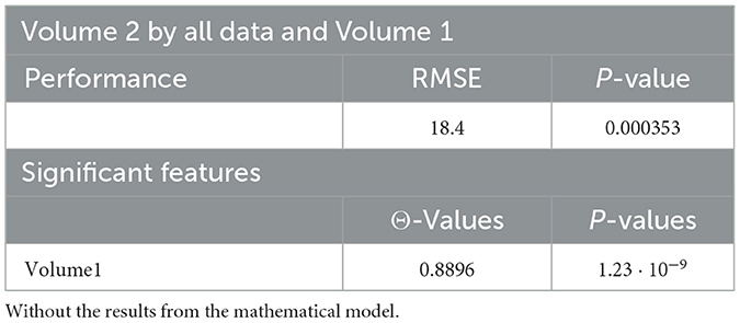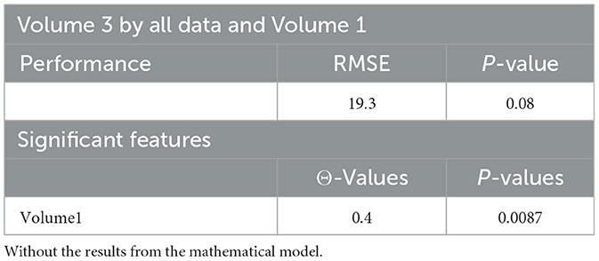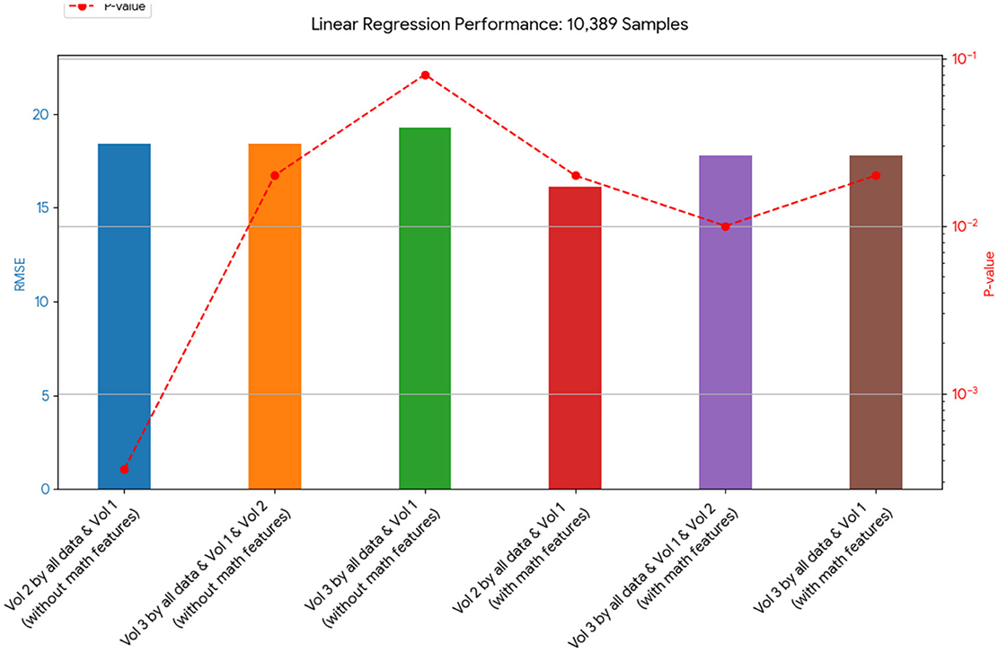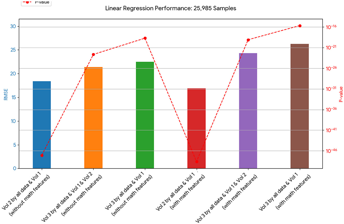 Tables 4, 20, and 21 present the linear regression predictions without mathematical features (first dataset, 10,389 samples), whereas Table 5 includes these features. Although the p-values remained similar, the RMSE values decreased with the addition of mathematical features. For example, the RMSE for Volume 2 dropped from 18.4 (Tables 4, 20, 21) to 16.1 (Table 5), and for Volume 3, it decreased from 19.3 to 17.8.
