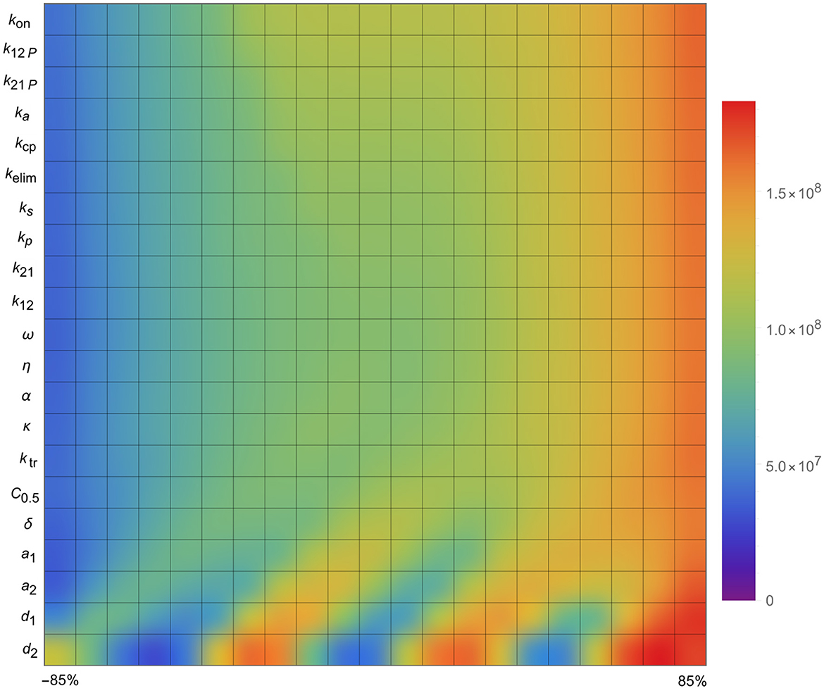 In this section, we evaluated how changes in specific model parameters could influence predicted outcomes. To do this, we conducted a local sensitivity analysis, systematically varying each parameter from −85% to 85% of its value.