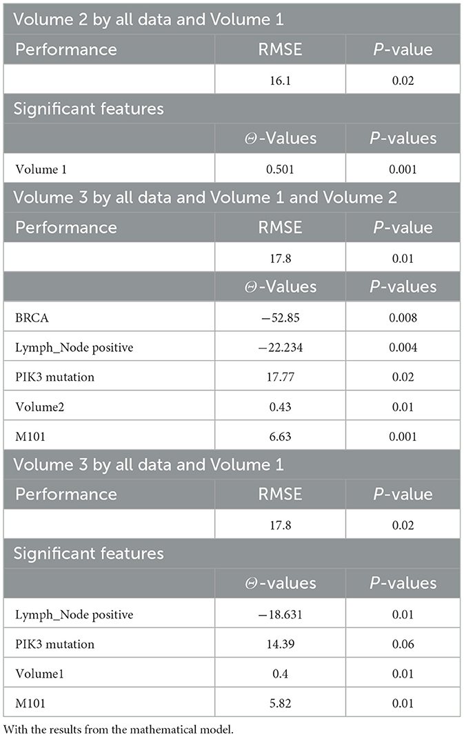 This indicates that incorporating mathematical model outputs into ML models improves prediction performance. Tables 4, 20, and 21 identified BRCA and Volume 2 as significant, while Table 5 additionally highlights Lymph and PIK3CA, providing further insights into treatment-relevant factors. Notably, the feature M101 (chemotherapy administered on day 101) was found to be significant, suggesting its potential role in personalized treatment adjustment.