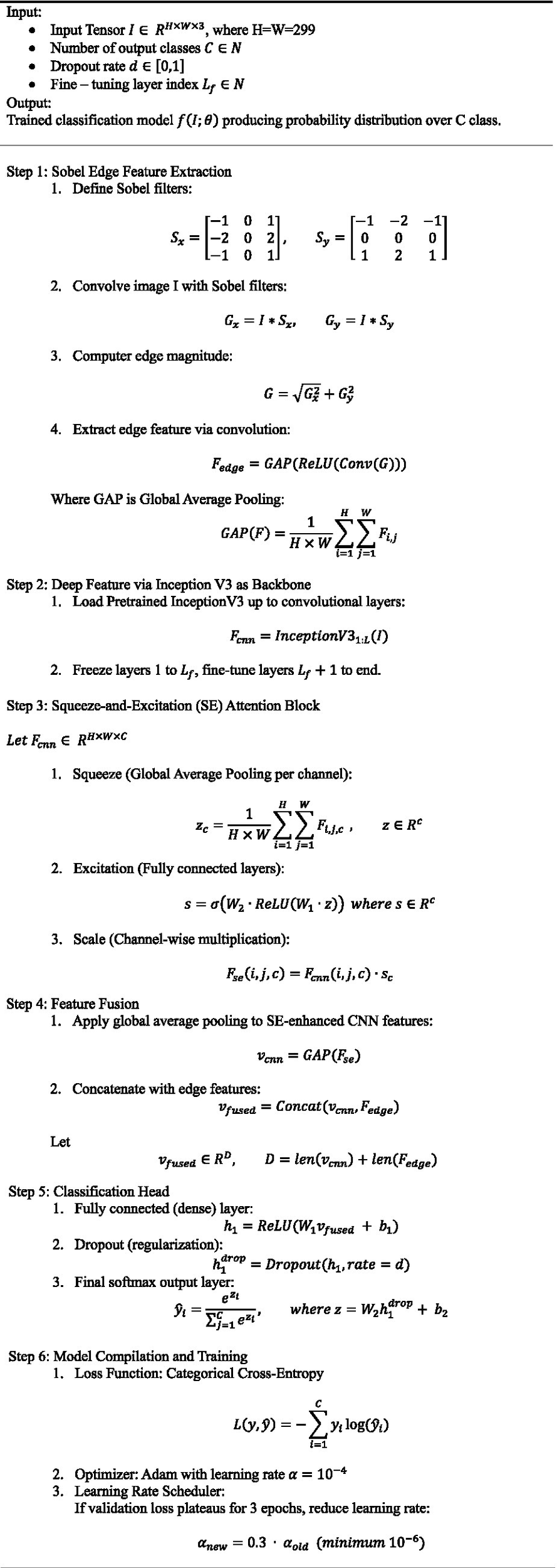 One notable strength is the trainability control: by freezing most of the InceptionV3 layers and fine-tuning only the top layers, the model maintains generalization while still adapting to new data. This significantly reduces the risk of overfitting and shortens training time. Algorithm 1, describing the hybrid model that combines InceptionV3, squeeze-and-excitation (SE) blocks, and edge detection for brain tumor classification.
