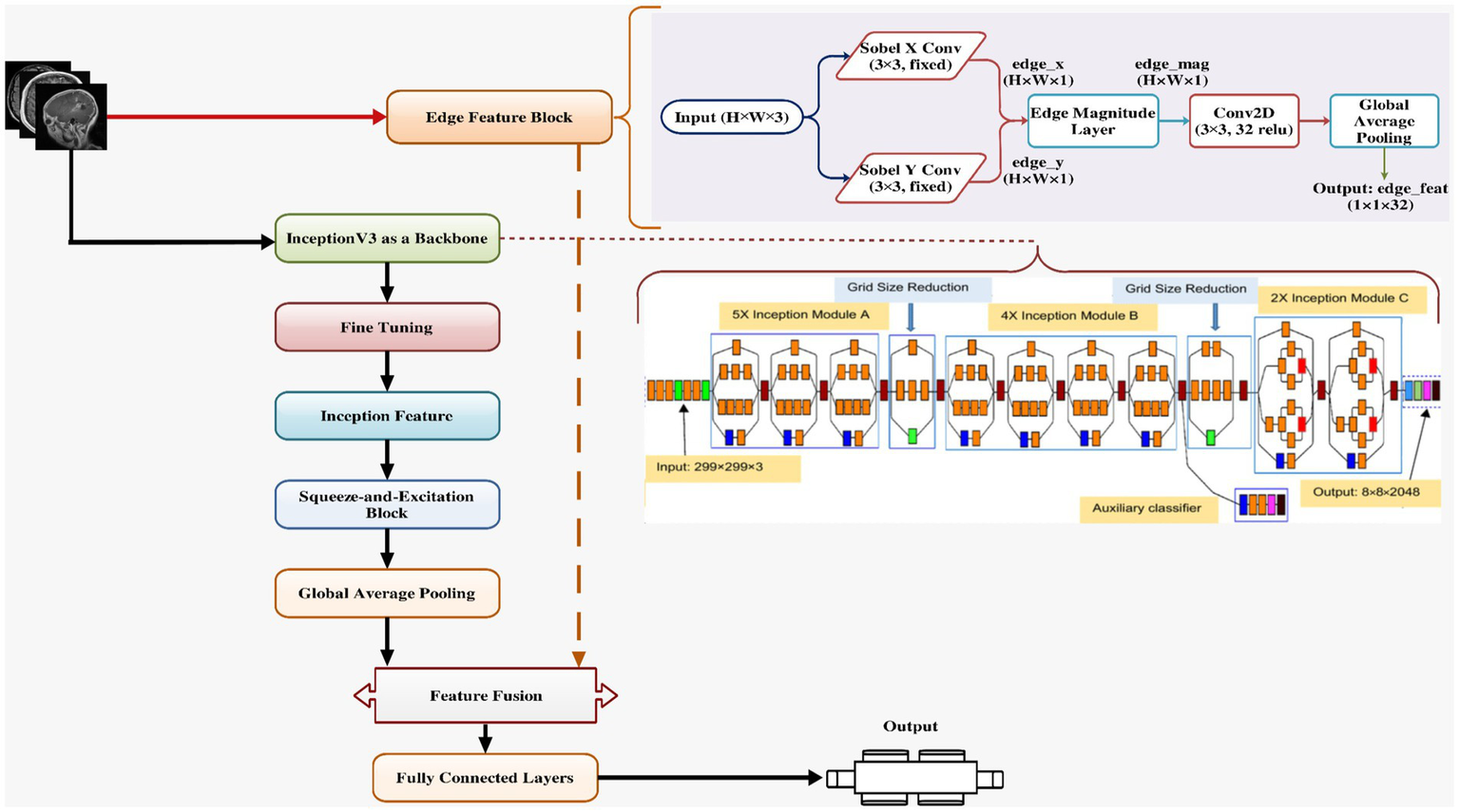 • Edge-aware dual-branch architecture: A dual-branch framework combining InceptionV3 with an Edge Feature Block to capture both semantic and boundary-level features, improving brain tumor detection and grading.