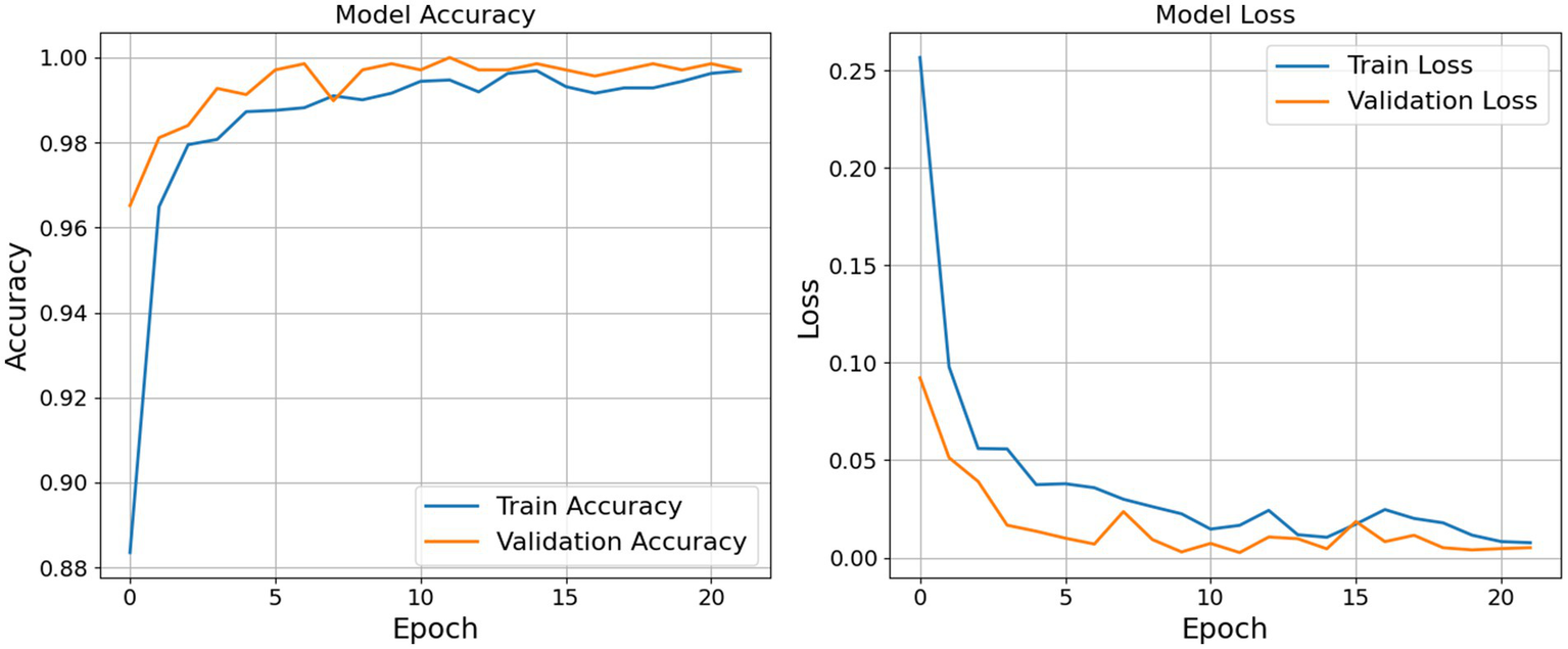 As shown in the left subplot of Figure 6, the training accuracy exhibited a sharp increase during the initial epochs, rising from approximately 0.88 to over 0.98 within the first five epochs. This indicates that the model was able to rapidly learn meaningful patterns from the data. Beyond this point, accuracy improvements continued at a slower rate and plateaued near 0.9950, suggesting that the model reached a high level of predictive performance on the training data.