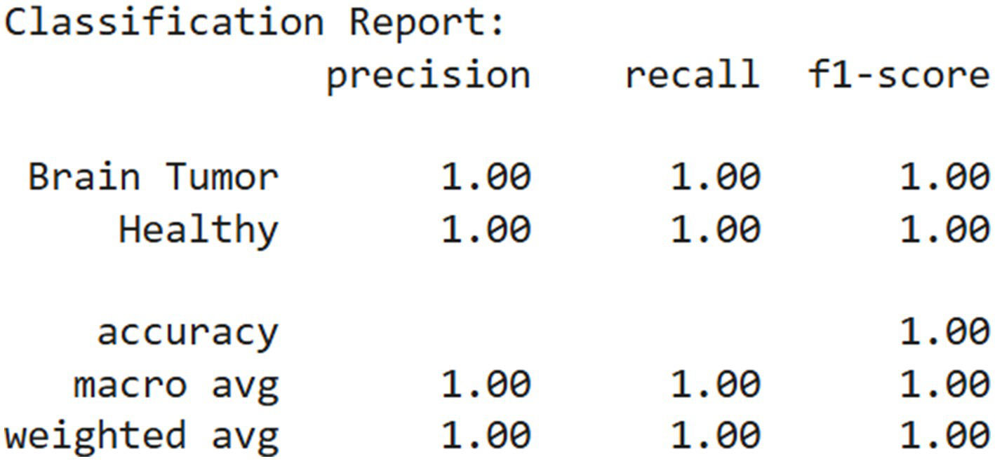 This outcome demonstrates that the model achieved perfect classification on the evaluated dataset, with 1.0000 accuracy, precision, recall, and specificity. The absence of any error implies that the model was highly effective at learning and distinguishing between the two classes. However, while such performance is impressive, it is essential to validate the model on an independent test set to confirm that it generalizes well to unseen data and is not merely overfitting the training or validation data.