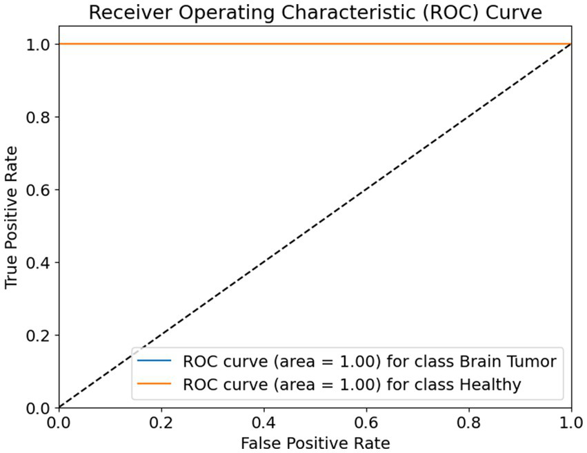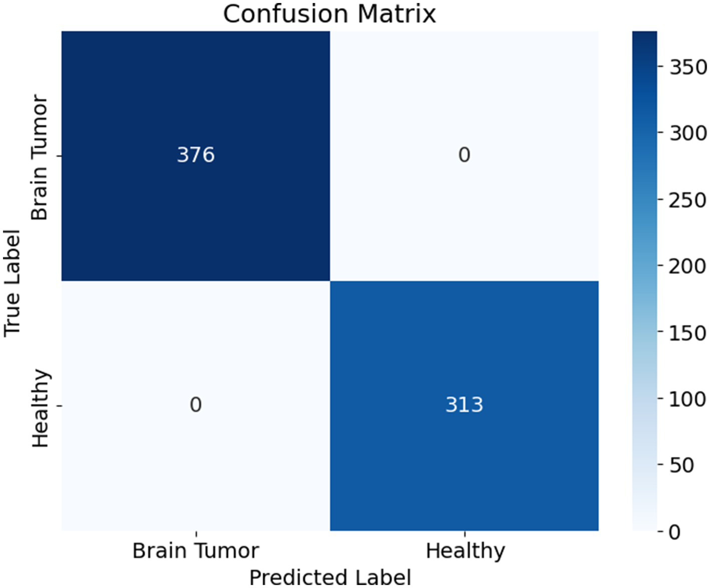 The confusion matrix presented in Figure 8 illustrates the performance of a binary classification model designed to differentiate between brain tumor cases and healthy individuals. The matrix shows that the model correctly classified all 376 brain tumor cases as positive and all 313 healthy cases as negative, with no instances of misclassification. Specifically, the top-left cell indicates 376 true positives, meaning all patients with brain tumors were accurately identified. The bottom-right cell shows 313 true negatives, reflecting that all healthy individuals were correctly predicted as such. Notably, the matrix contains no false positives or false negatives, as indicated by the zero entries in the off-diagonal cells.
