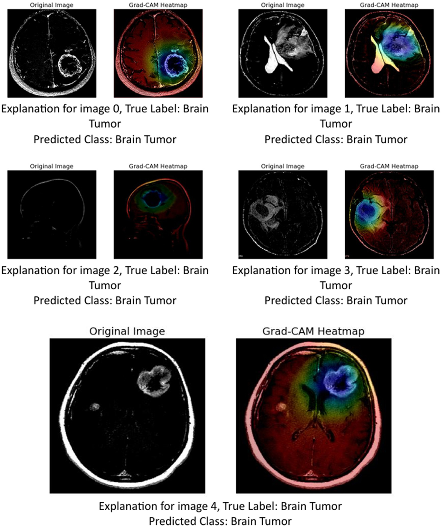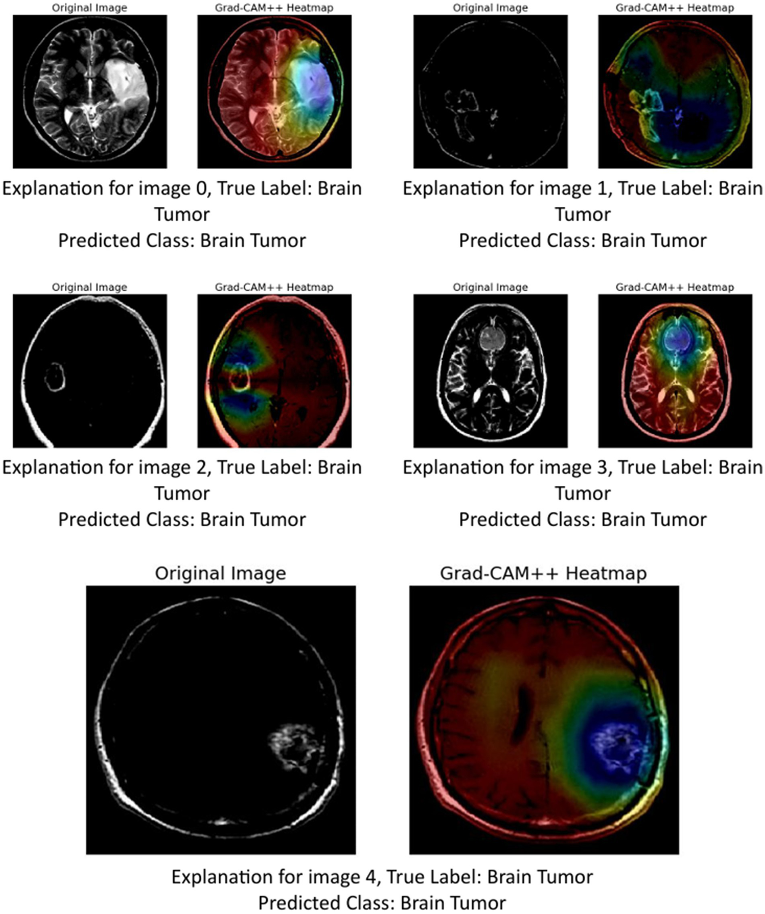 These visualizations demonstrate (Figure 13) that Grad-CAM++ offers high-resolution, interpretable insights into CNN-based tumor detection models. It not only reveals the correct regions of interest (ROIs) within the MRI scans but also provides medical professionals with a visual validation of model predictions, which is essential for building trust in AI-assisted diagnostics. The consistent overlap between activated areas in the heatmaps and the actual tumor locations supports the use of Grad-CAM++ as a credible explainability method in medical imaging research.