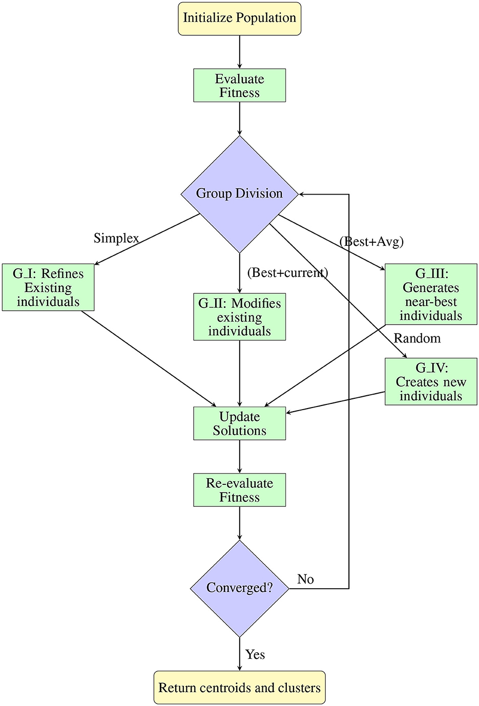 Group I improves local exploitation of promising candidate solutions by including the Nelder-Mead simplex approach. The improved individuals will enhance clustering accuracy and solution stability without sacrificing global exploration, based on our simplex operations analysis and the design of the SMCFO method. The simplex-enhanced architecture ensures effective convergence toward high-quality cluster centroids by balancing intensive local search and broad global exploration. The following section presents the complete SMCFO algorithm in flowchart and pseudocode form.