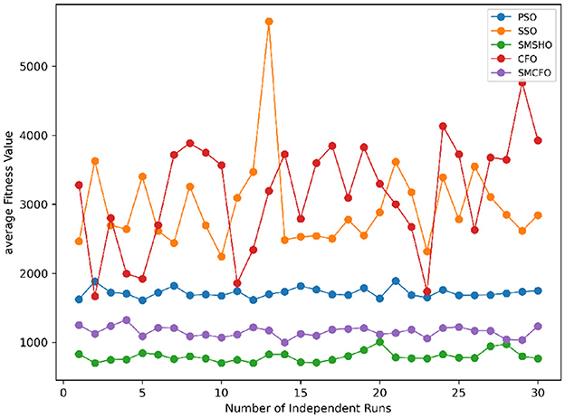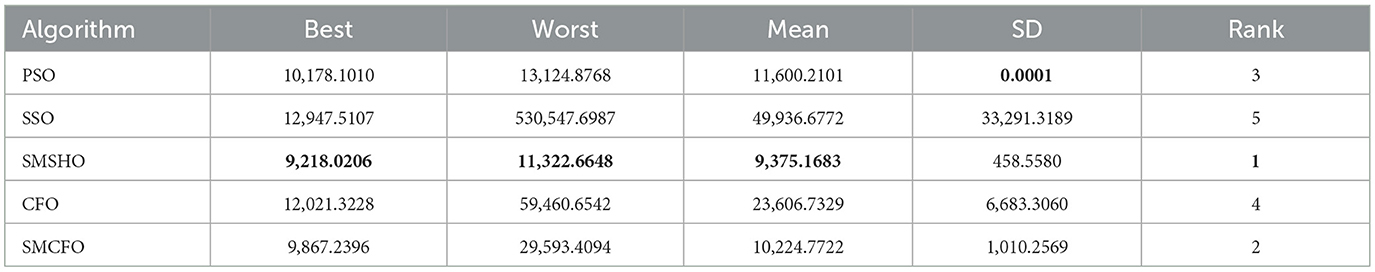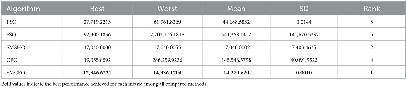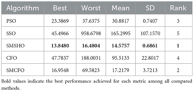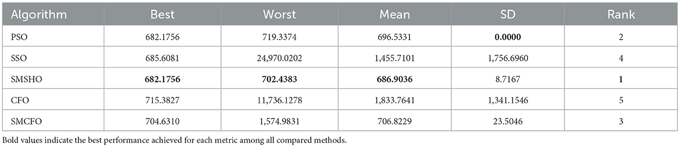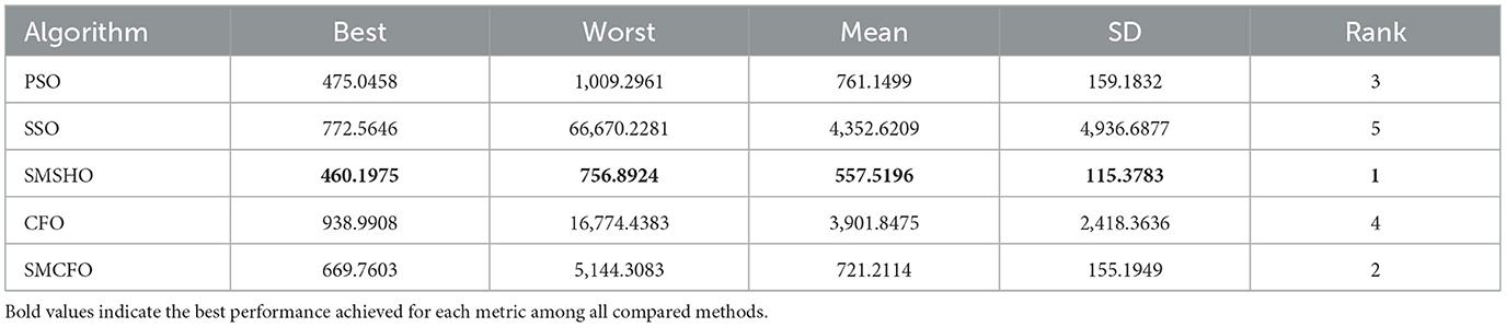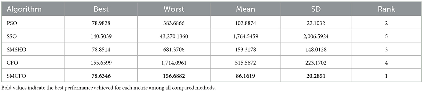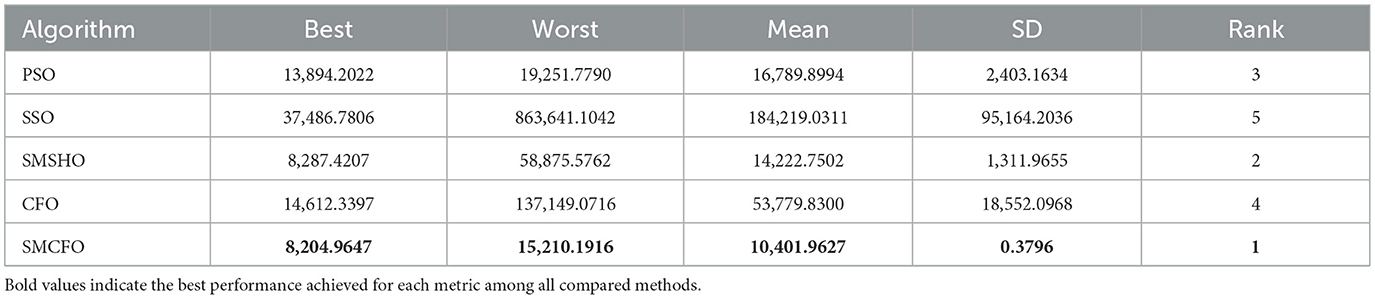 Each experiment is independently repeated 30 times for each algorithm to minimize the impact of randomness in the comparison algorithms. Each run has a maximum of 200 iterations, with a population size 52 for all algorithms. The evaluation metrics include the best value, worst value, mean value, and standard deviation. Tables 2–16 present the experiment's findings, with the best-performing results indicated in bold. “Rank” denotes a thorough rating, usually based on the algorithm's optimization performance and obtained from the mean value.