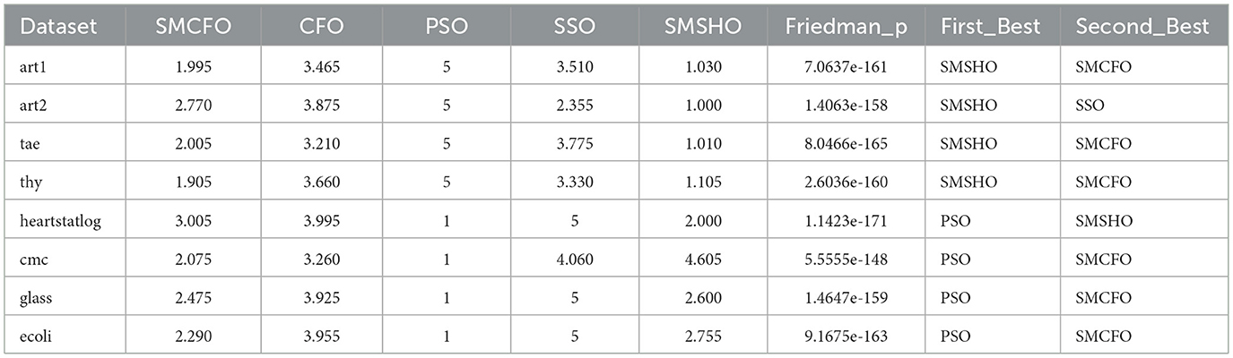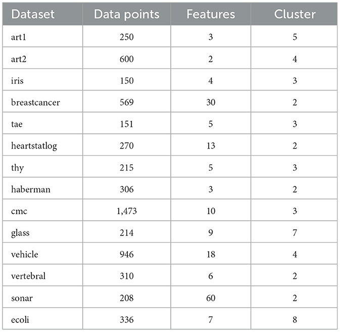 The proposed SMCFO algorithm significantly contributes to the study of data clustering analysis. The evaluation analyzes performance using 14 benchmark datasets, which include two synthetic datasets and 12 real-world datasets from the UCI Machine Learning Repository (Merz, 1998). Table 1 details the number of data points, features, and clusters for each dataset. All comparison algorithms will use the randomly selected parameters for the art1 and art2 datasets (Niknam and Amiri, 2010). Since each dataset has unique characteristics, no algorithm consistently achieves the best results in all experiments. Consequently, the experimental outcomes genuinely evaluate the proposed algorithm's performance.