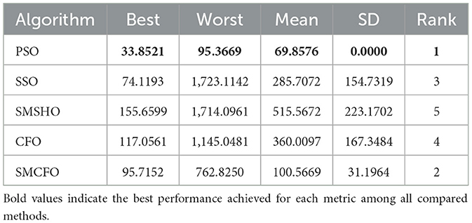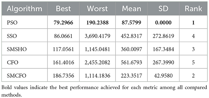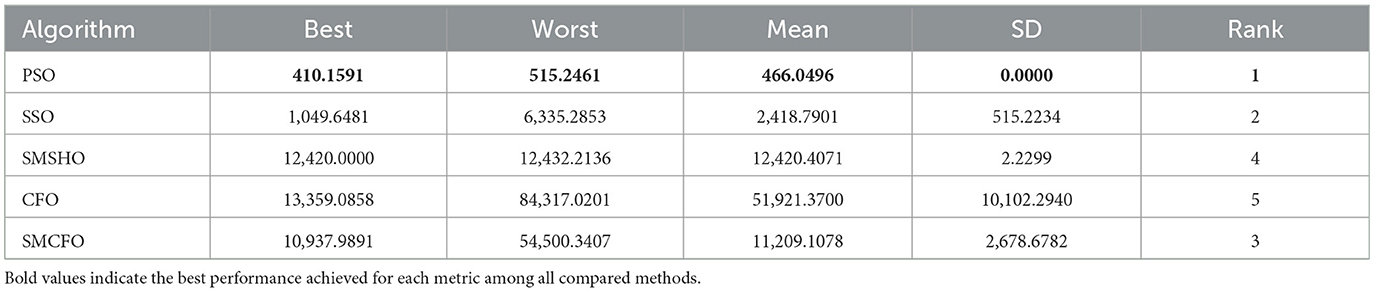 3. This study compares the proposed algorithm with several established clustering algorithms, including PSO (Rengasamy and Murugesan, 2021), SSO (Thalamala et al., 2019), SMSHO (Zhou et al., 2017), and CFO (Eesa et al., 2013). It performs a thorough analysis and evaluation of these algorithms in the context of data clustering. The experimental results reveal that the proposed algorithm attains faster convergence, higher accuracy, and more excellent stability than the other methods.