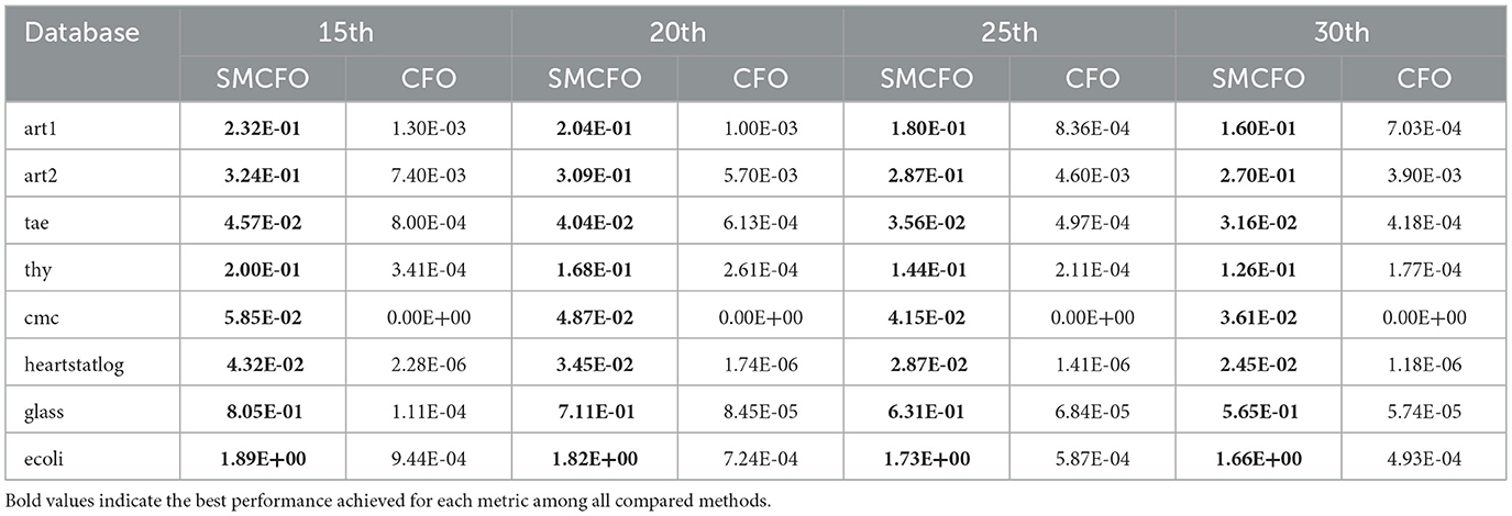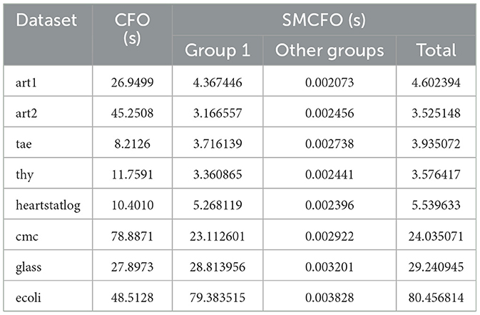 The runtime comparison between SMCFO and CFO across benchmark datasets highlights the efficiency gains and the computational overhead introduced by the simplex-enhanced design. SMCFO provides significant performance in datasets such as art1, art2, thy, cmc, and heartstatlog, as Table 17 shows. art2 shows the most significant improvement, with a 70% reduction in execution time from 45.25 to 13.33 seconds. These cases highlight how the Nelder-Mead simplex method accelerates convergence and reduces computational cost when the search space is relatively low-dimensional or moderately complex.
