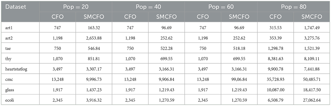 The proposed SMCFO algorithm demonstrates enhanced performance through a comprehensive evaluation across multiple benchmark datasets and population sizes. SMCFO consistently achieves lower or comparable mean fitness values to the original CFO, particularly at smaller populations such as 20, 40, and 60. Table 18 shows that SMCFO can explore the solution space more effectively and converge toward optimal solutions faster, even with fewer search agents. For instance, at a population size of 40, the fitness value for the art2 dataset dropped from 1,198 (CFO) to 252.62 (SMCFO), showcasing an impressive improvement in solution quality. In addition to solution quality, SMCFO demonstrates improved stability and robustness across diverse datasets with varying feature sizes and class distributions. Unlike CFO, which often shows flat performance regardless of population variation, SMCFO adapts dynamically and produces competitive results even on complex datasets such as thy, glass, and ecoli. While in some cases, such as at higher population sizes (e.g., 80), SMCFO incurs slightly higher fitness values due to increased complexity in local search computations, the overall trend favors the proposed method regarding both effectiveness and efficiency. SMCFO's ability to balance global exploration with local exploitation more precisely makes it a superior choice for clustering tasks where both accuracy and computational cost are critical.
