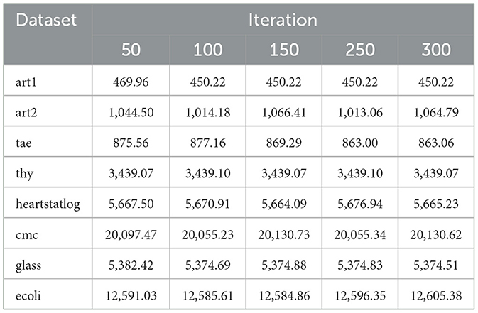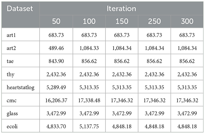 The algorithm illustrates greater population diversity during the earlier phases of the search process. Higher spatial distribution of individuals improves the chances of reaching the global optimum. The fitness values continue to converge to the global optimum as the search advances, which causes a reduction in population diversity. The study highlights the importance of early search iterations to enable a meaningful comparative assessment. Variance values are analyzed at the 15th, 20th, 25th, and 30th iterations. Table 16 presents experimental results, and Figures 20–27 present variance trends for the art1, art2, tae, thy, cmc, heartstatlog, glass, and ecoli datasets. Table 16 illustrates that the new algorithm always generates a higher variance of fitness values than the existing algorithm in early iterations. The distribution of broader solutions indicates greater population diversity and better global search ability. Figures 20–27 demonstrate that the suggested approach has more variance than the original algorithm during the initial optimization phase. This high variance is not a random fluctuation. Still, it follows a stable and consistent pattern, proving that the proposed algorithm's increased population diversity is systematic and not random.